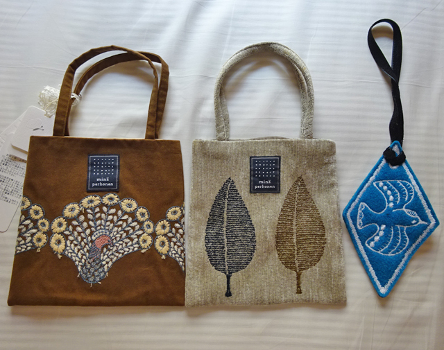 ミナペルホネン★ミニバッグ★3点★peacock★happa★チャーム★茶★mina perhonen★バッグ★未使用品★葉っぱ★小鳥★クジャク★ブルー