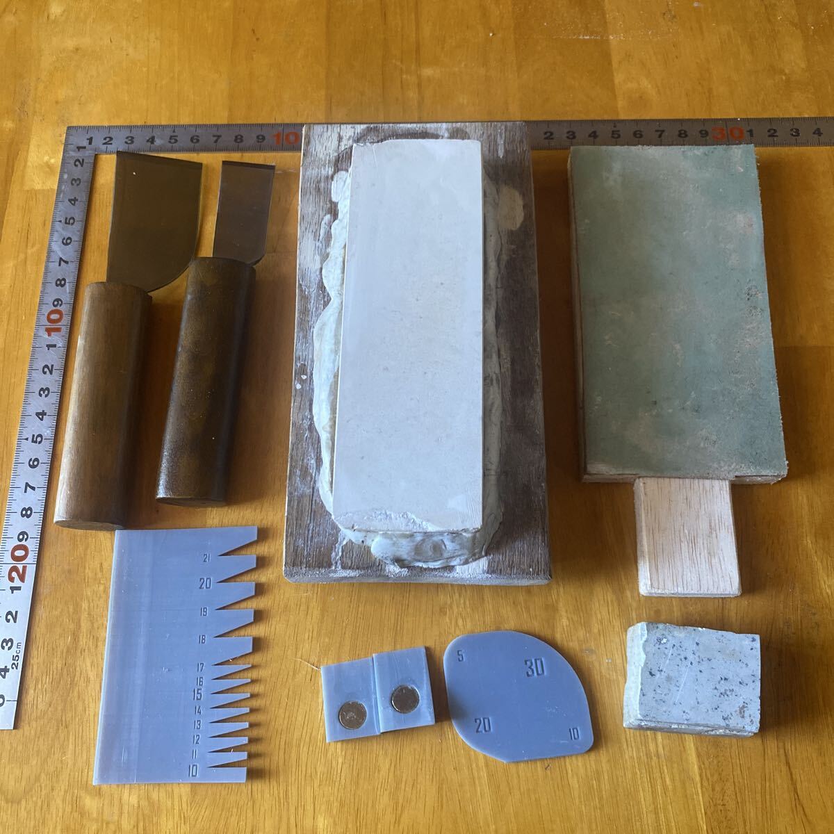 内容は革包丁(大小一本づつ)、天然砥石、天然名倉砥石、革砥、研ぎ治具、刃角度計、コーナー定規です。