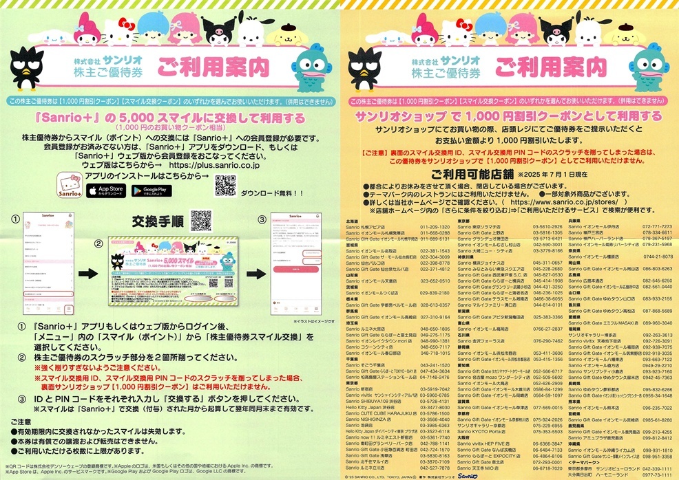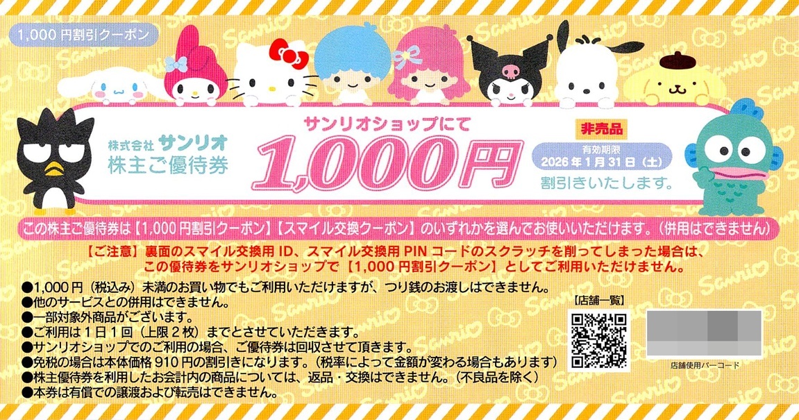 【ご注意】 裏面のスマイル交換用ID、スマイル交換用PINコードのスクラッチを削ってしまった場合は、この優待券をサンリオショップで【1,000円割引クーポン】としてご利用いただけません。