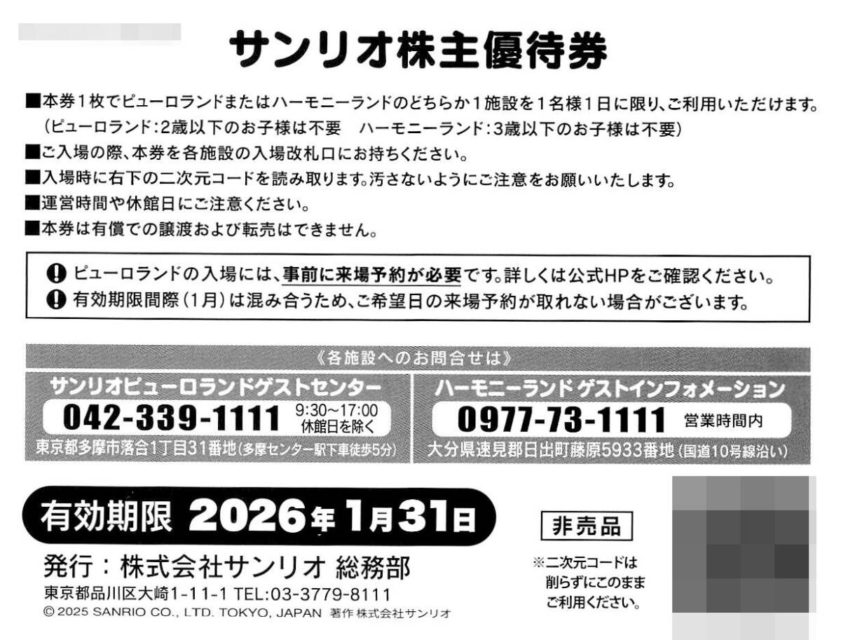なお、オマケとして、優待券他と一緒に送られてきた、「サンリオ株主ご優待券ご利用案内、サンリオプラスのご利用案内、サンリオピューロランド、ハーモニーランドのパンフレット」(以下、パンフレット/「商品画像」を参照)をお付けします(各パンフレットは、折り畳まれた状態で受領しています。また、パンフレットご不要の場合は、パンフレットを除いての発送とします)。