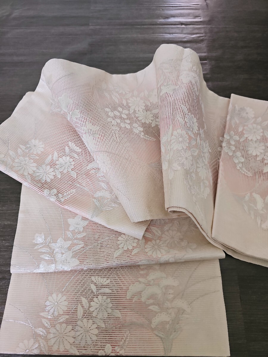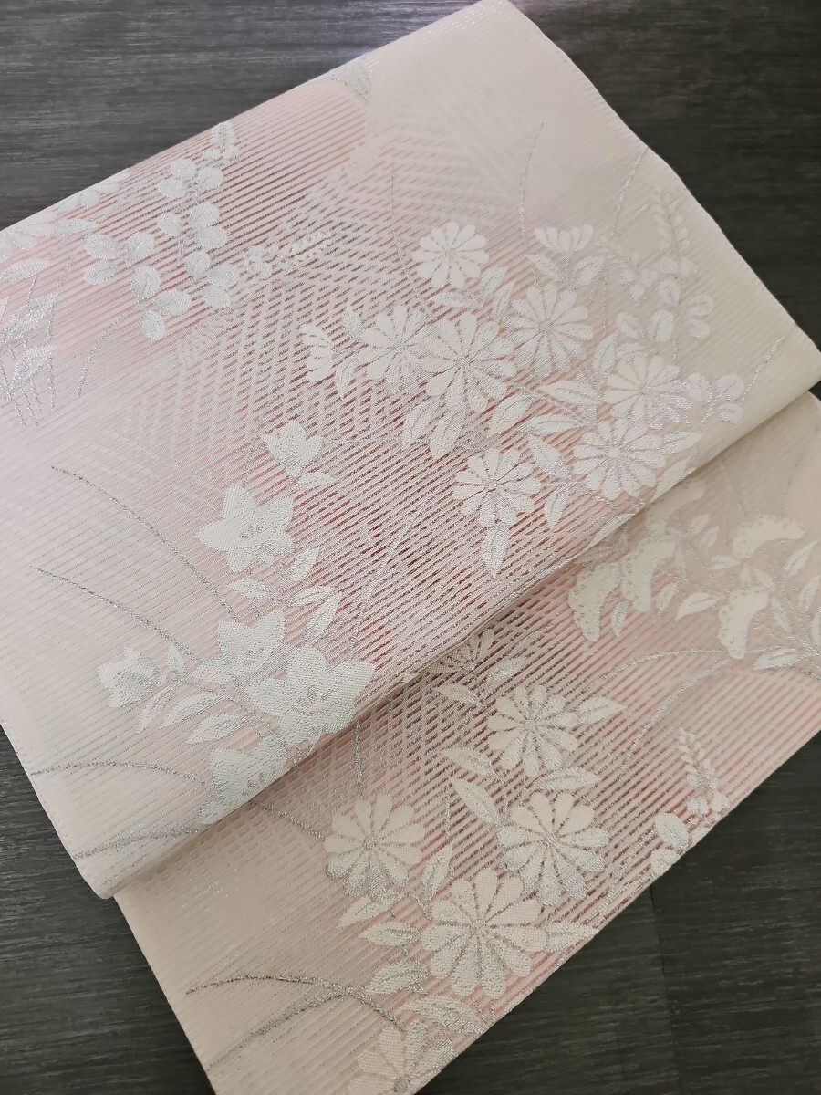 【西陣国定織物(株)】、程良い張りの有る滑かな絽綴れ織、銀糸使いの花葉文様と暈し色分けが女性美に満ちた上等なお品ものでございます。