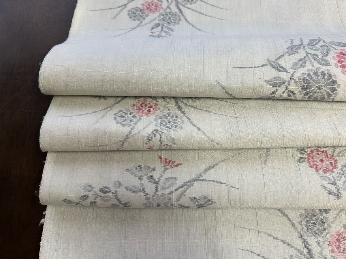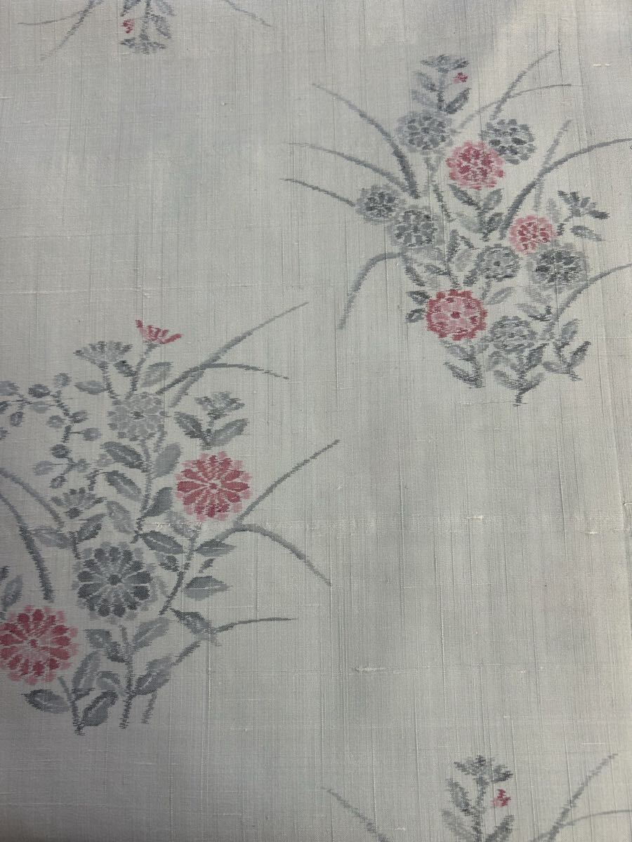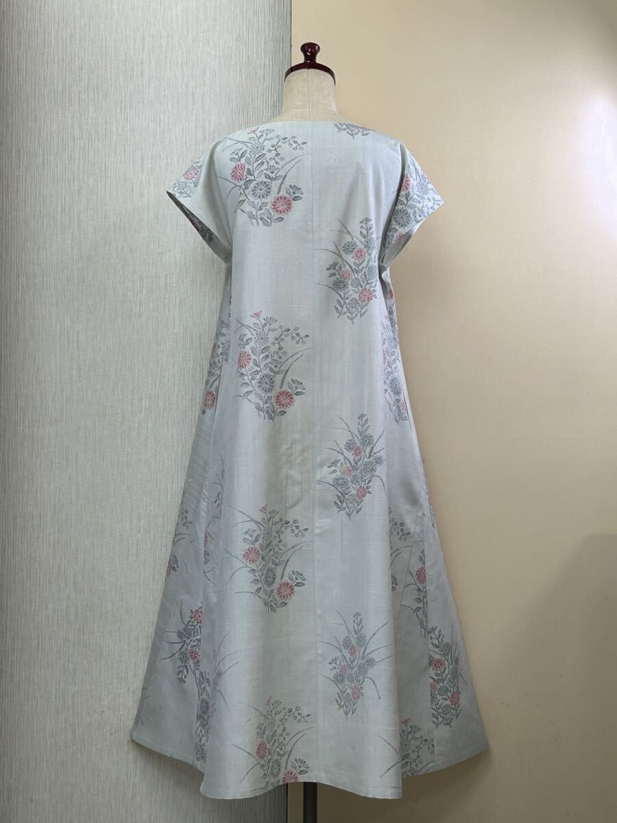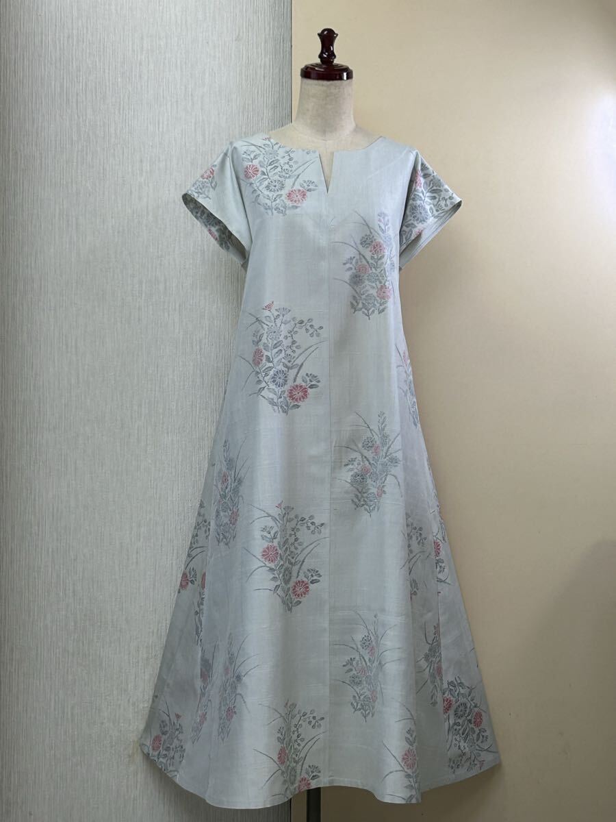 着物リメイク★ 正絹★ 紬★薄灰色★草花★フレンチスリーブ★胸元Vカット、ロングフレアーワンピース