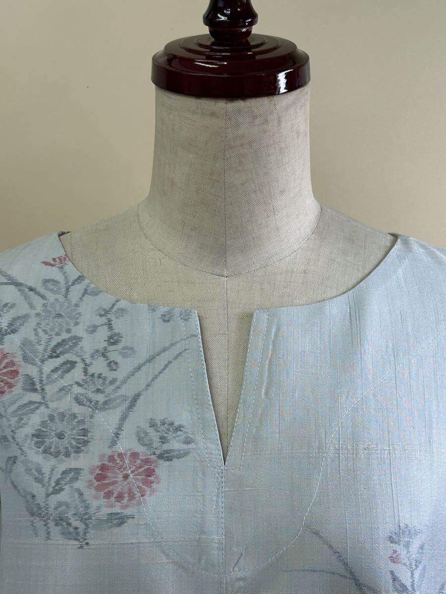★正絹、紬の着物より「フレンチスリーブ、胸元Vカット、ロングフレアーワンピース」を作りました。