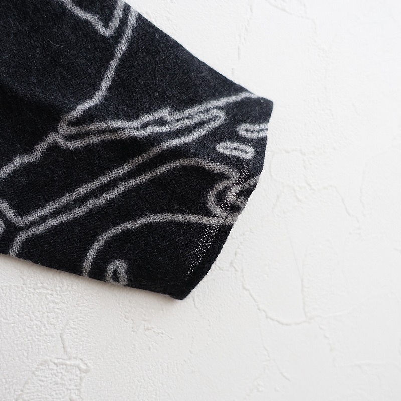 JURGEN LEHLのプリントウールスタンドカラー長袖シャツです。カラーはブラック×ホワイトで、総柄プリントのウールガーゼのような微起毛地で仕立てられております。スタンドカラーデザインで、フロントボタン開閉で着脱できます。