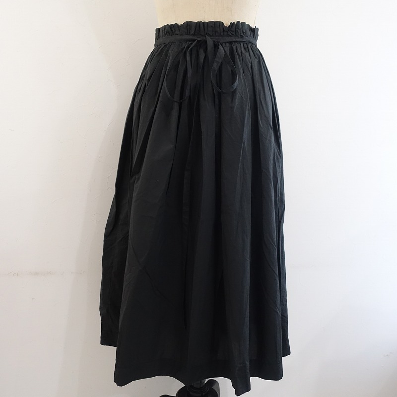 ICHIのコットンギャザーラップスカートです。カラーはブラックで、布帛地です。ウエストトップは共布フリル調で、ウエストギャザーが施されております。ウエストの紐を結んで着用するラップデザインで、ポケット・裏地は付いておりません。定価(メーカー希望小売価格)10,450円の商品です。