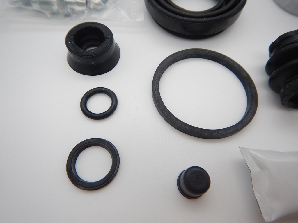 キット内容は画像のもので、シール・ブーツなどのゴム部品はもちろん、ブリーダー・ピストン・グリスもキットに含まれます。