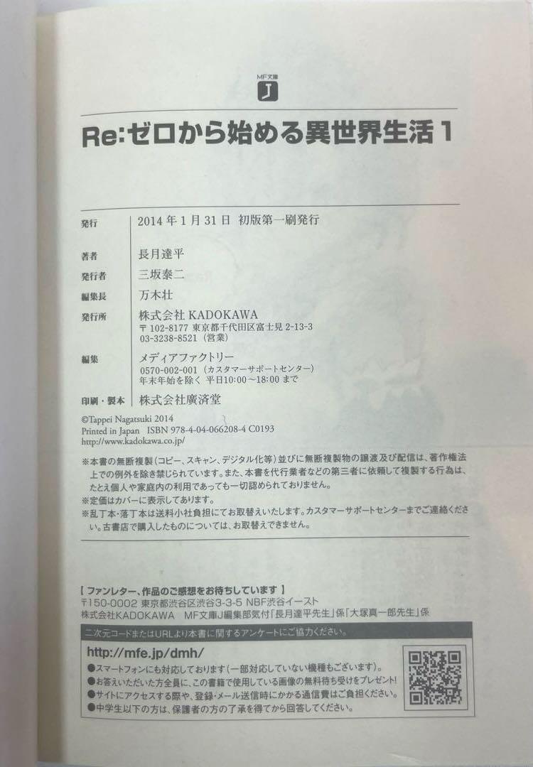 長月達平先生による大人気ライトノベル「Re:ゼロから始める異世界生活」の記念すべき1巻、貴重な初版本です!