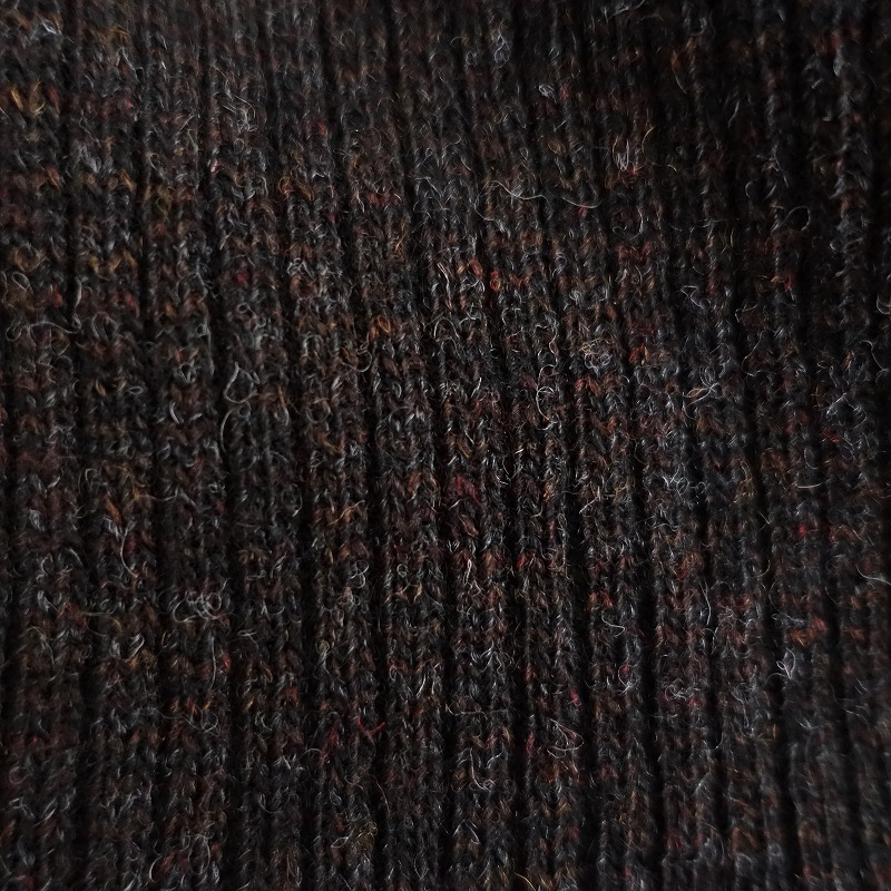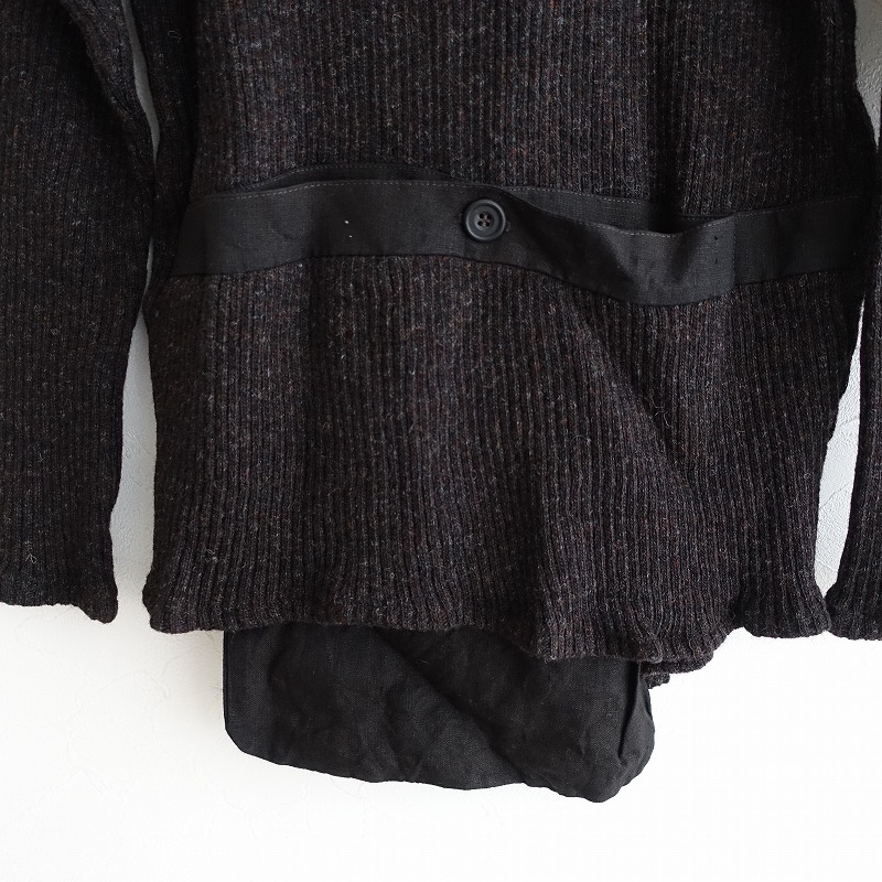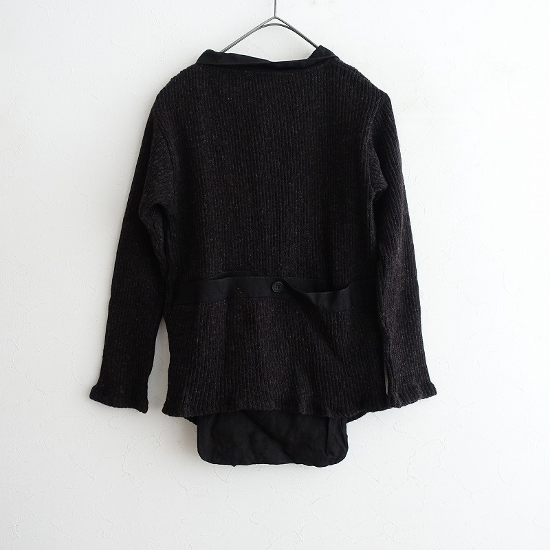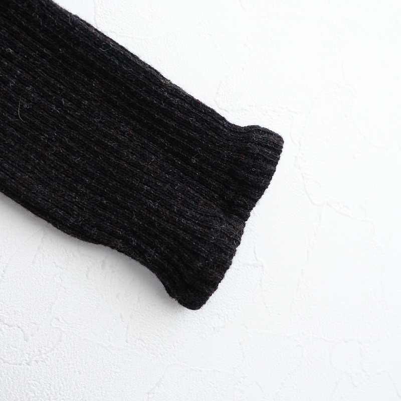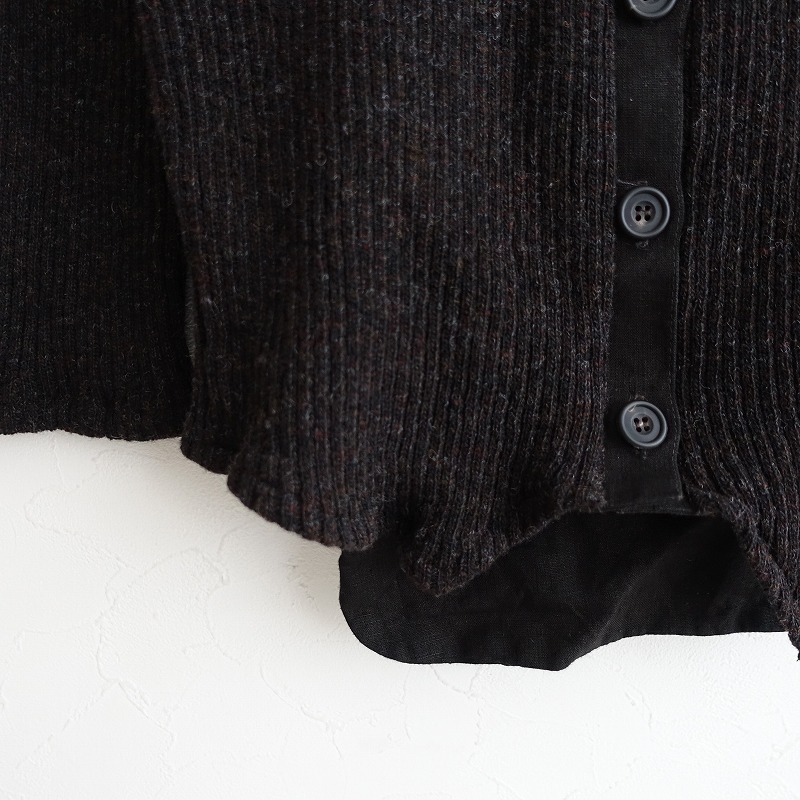 Paul HarndenのWomen’s ニットシャツです。カラーはブラック×ブラウン×チャコールグレーミックスの中厚手のリブニット地で仕立てられており、襟はリネン地に切り替えられております。フロントボタン開閉で着脱でき、バックウエストに大きなポケットが付いております。