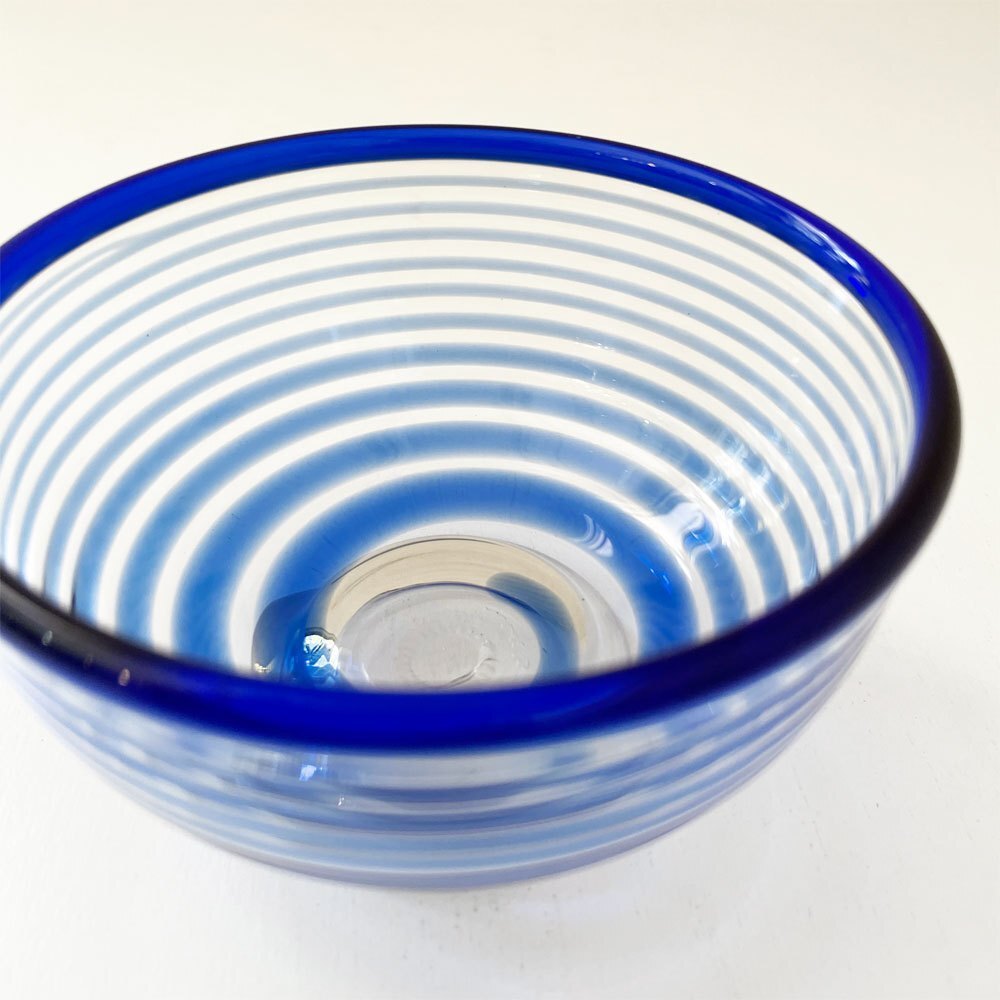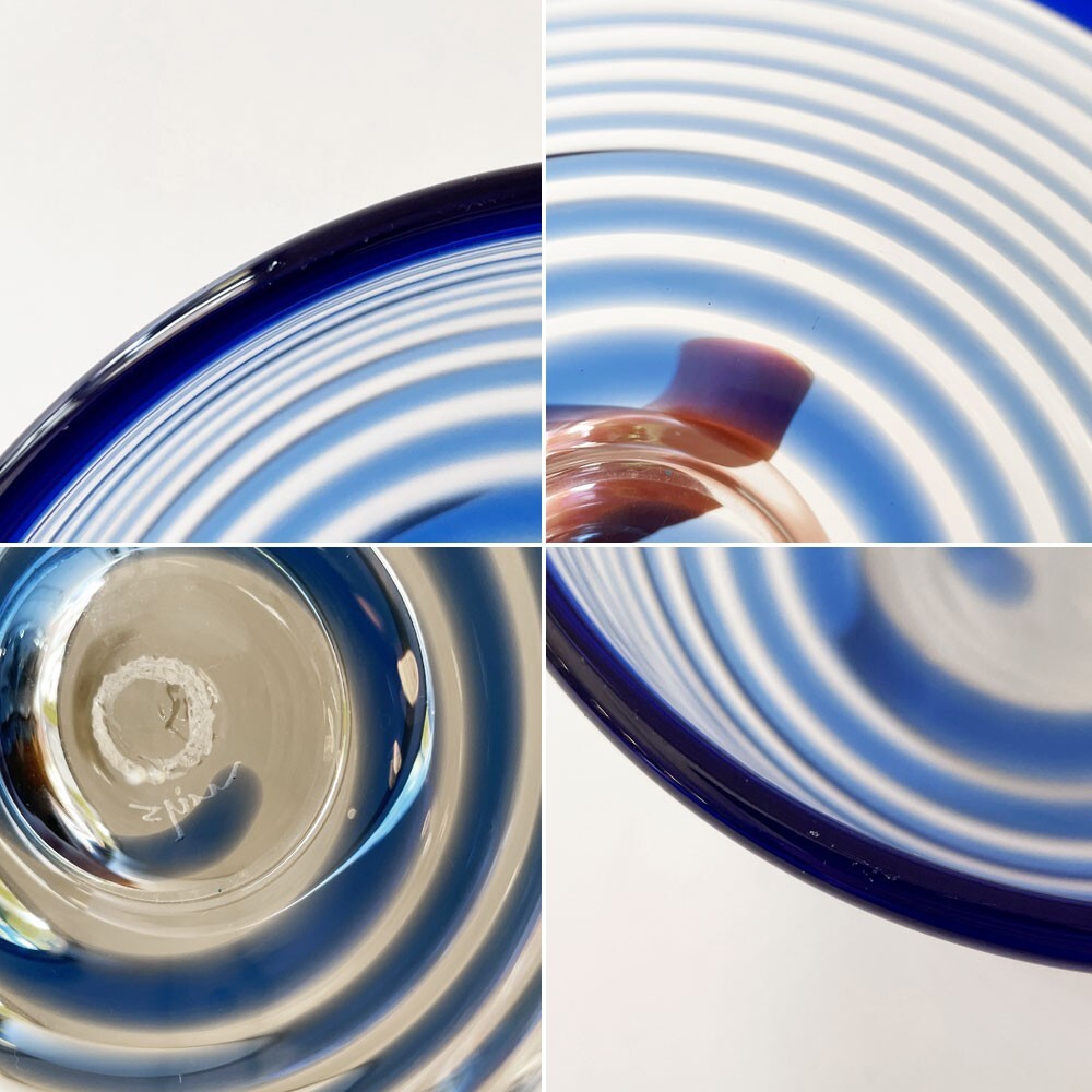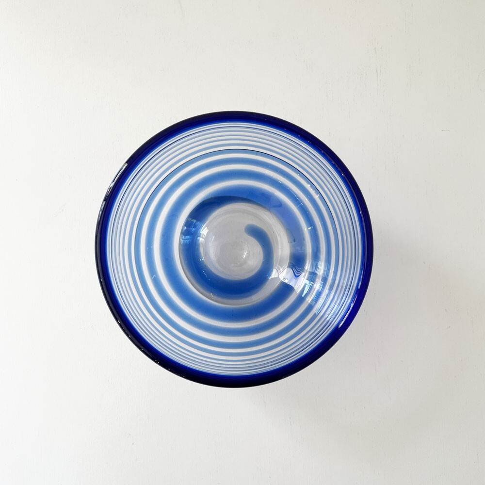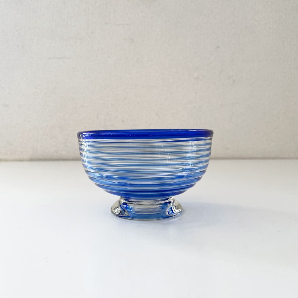 こちらはクリアとブルーのカラーリングが涼し気な脚付きのガラスボウル「くもの巣鉢」。ぐるぐると渦を巻く線巻による模様が印象的な1点です。