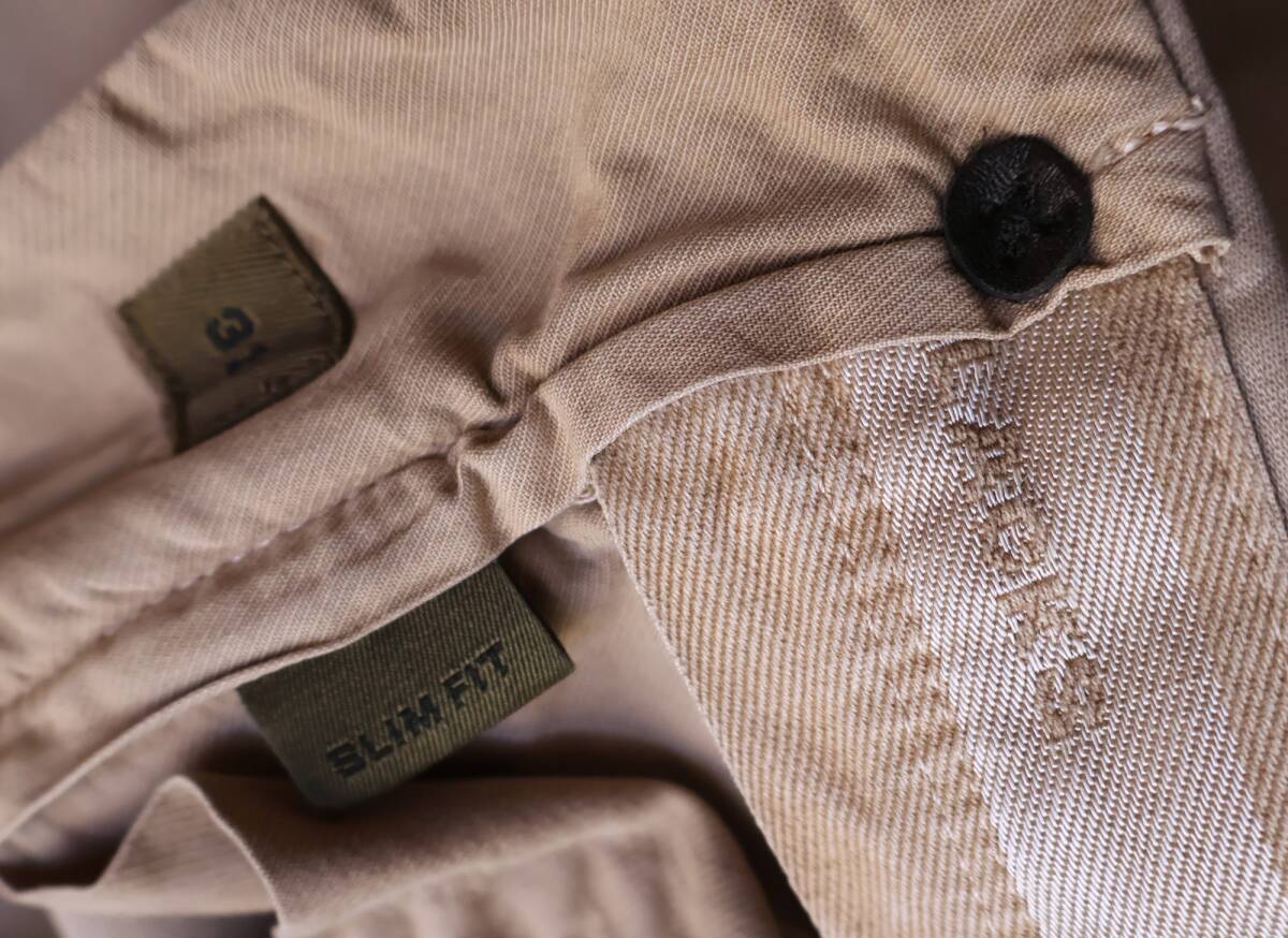 目付け(1平方メートルあたりの生地の重さ)は428グラム。耐久性に優れた中厚ファブリックですが、厚手すぎないので秋冬春の3シーズンに対応します。ストレッチ素材(ポリウレタン)が混紡されているので屈んだときや椅子に座ったときに生地が突っ張らないこともポイントです。すごくラクチンですよ。