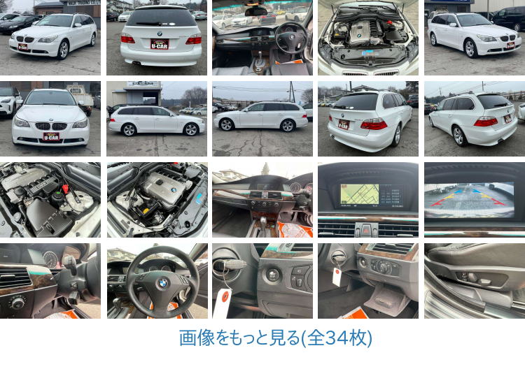 BMWの525iツーリングをご提案いたします。平成19年、走行距離は111000kmです。ホワイトパールが輝く美しいボディカラーでとても目を引きます。また、ステーションワゴンで使い勝手がよく、収納スペースの確保もしやすいです。装備面も、ABS横滑り防止装置、盗難防止装置、ETC、クルーズコントロール、シートヒーターがついており、快適なドライブをお楽しみいただけます。パワーシート、バックカメラも装備しております。この機会にぜひご覧ください。