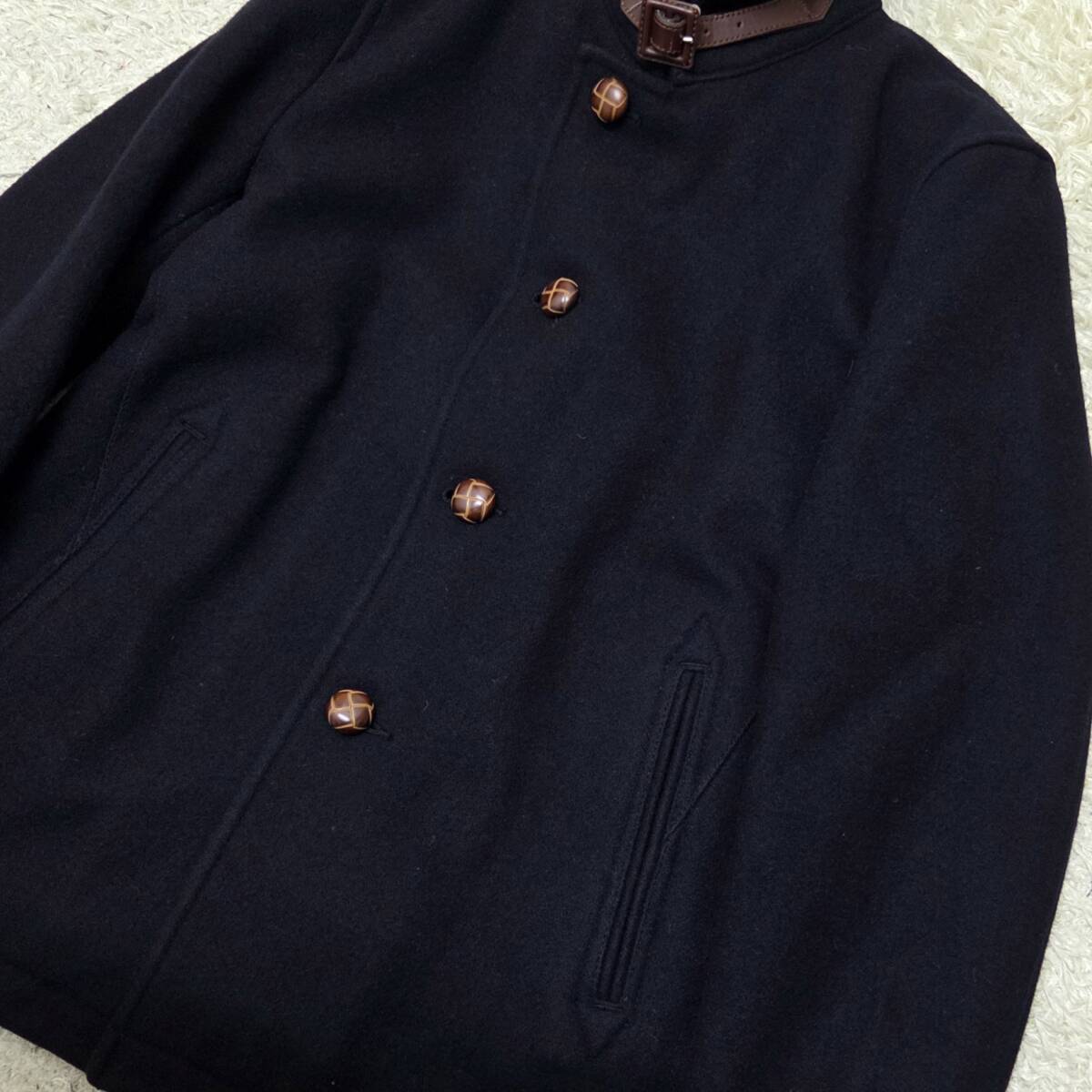 ビームス【大人のお洒落】BEAMS ジャケット ピーコート Pコート アウター 羽織 ウール 牛革 襟ベルト くるみボタン調 ブラック 黒 S