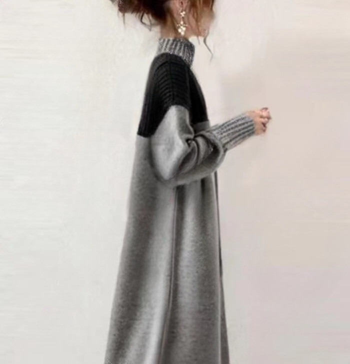 ┗スタンドリブネックでお洒落な雰囲気を演出するぽわん袖ニットロングワンピース