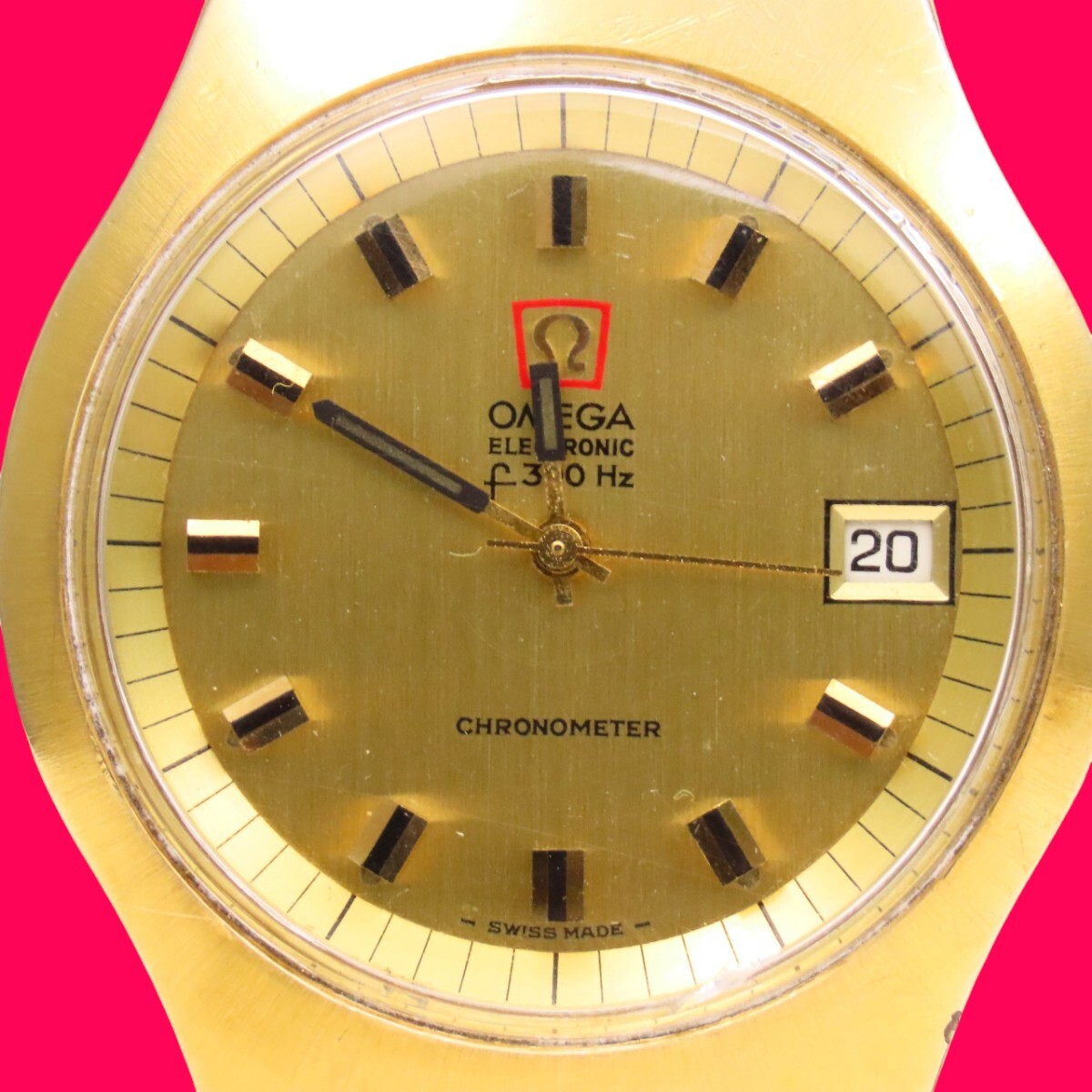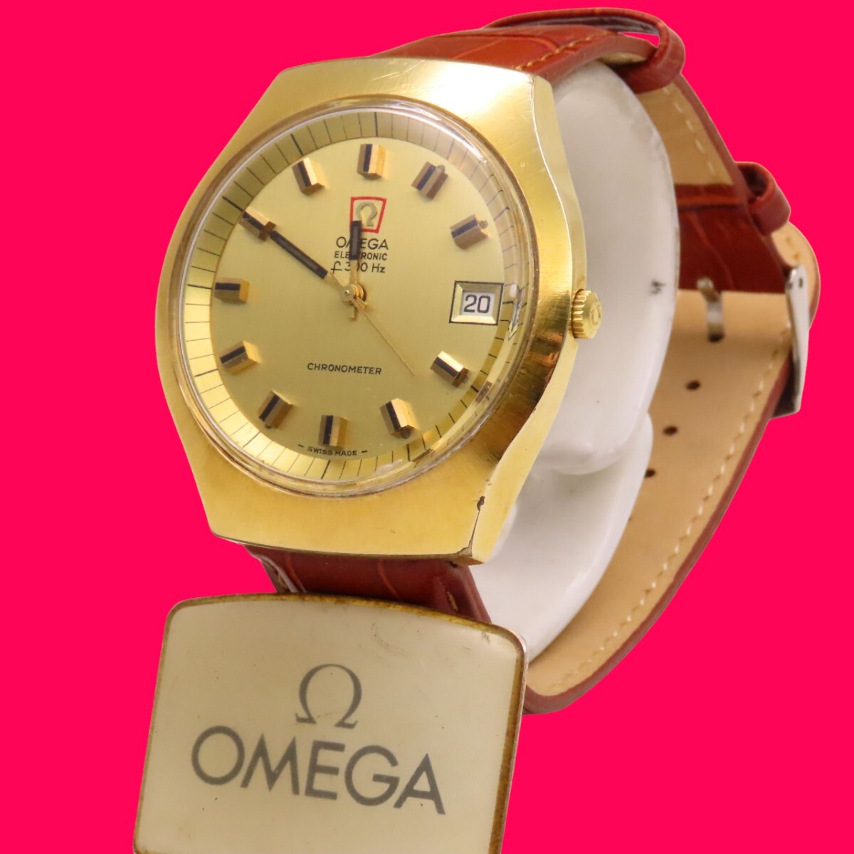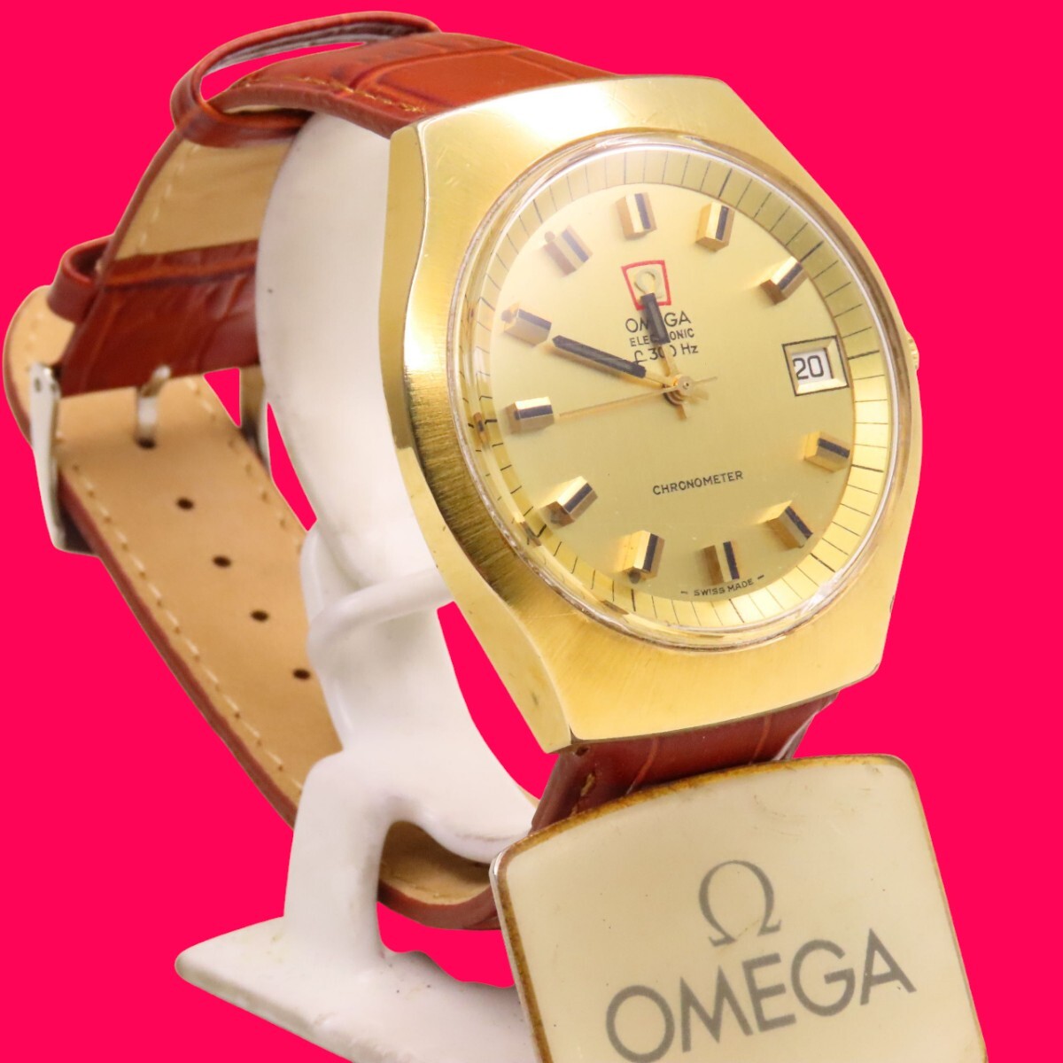 ■♪価格高騰! 資産価値!稼働 電池新品 ビンテージ メンズ 高級超レア! OMEGA オメガ エレクトロニック ELECTRONIC 高精度クロノメーター f300Hz デート 音叉 ベルト新品