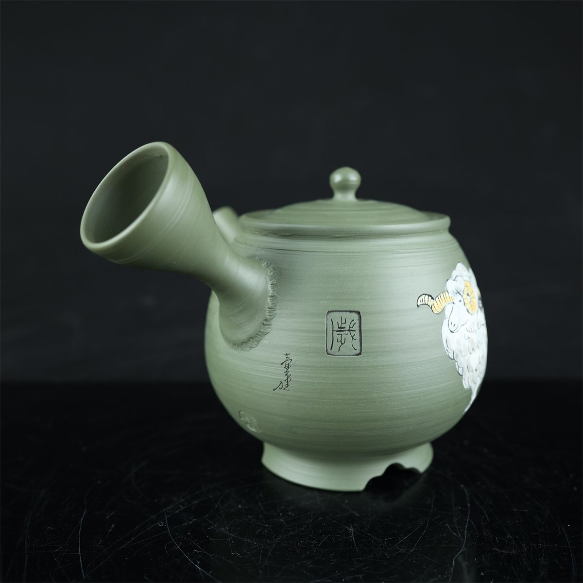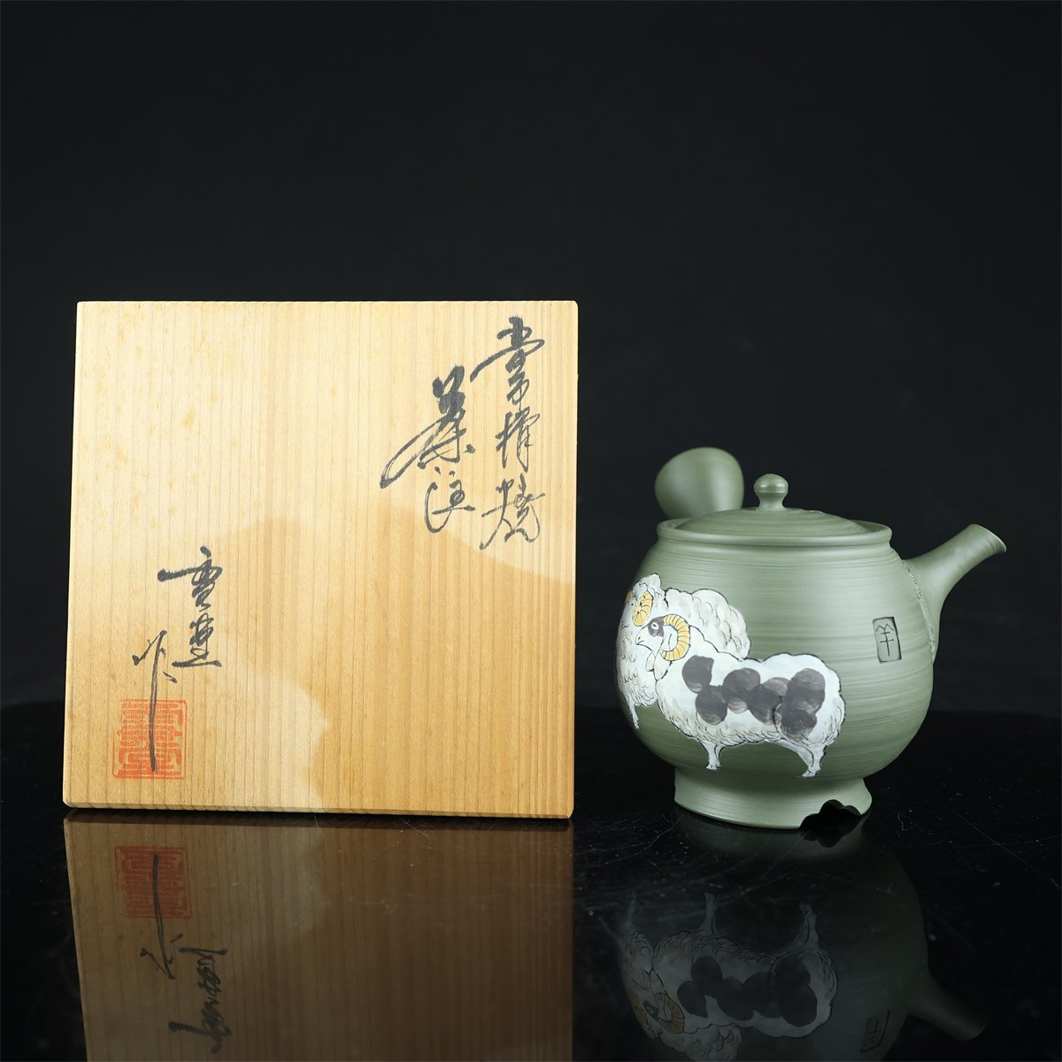 Product name: 【志】K1560 急須 吉川雪堂作 吉川壺堂刻 羊絵 緑泥 常滑焼 茶道具 茶注 共箱