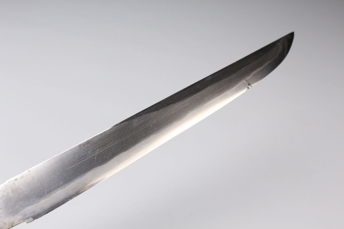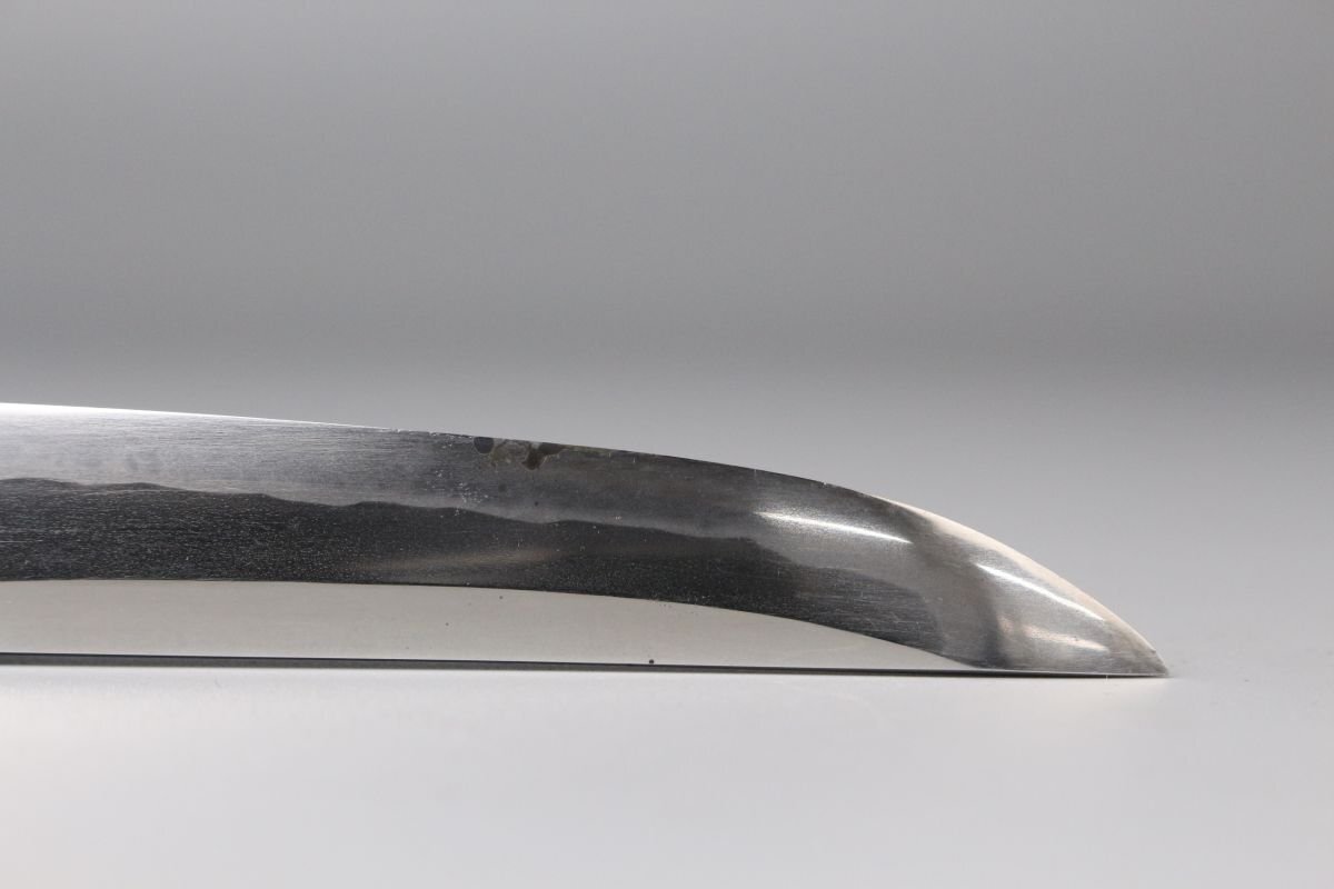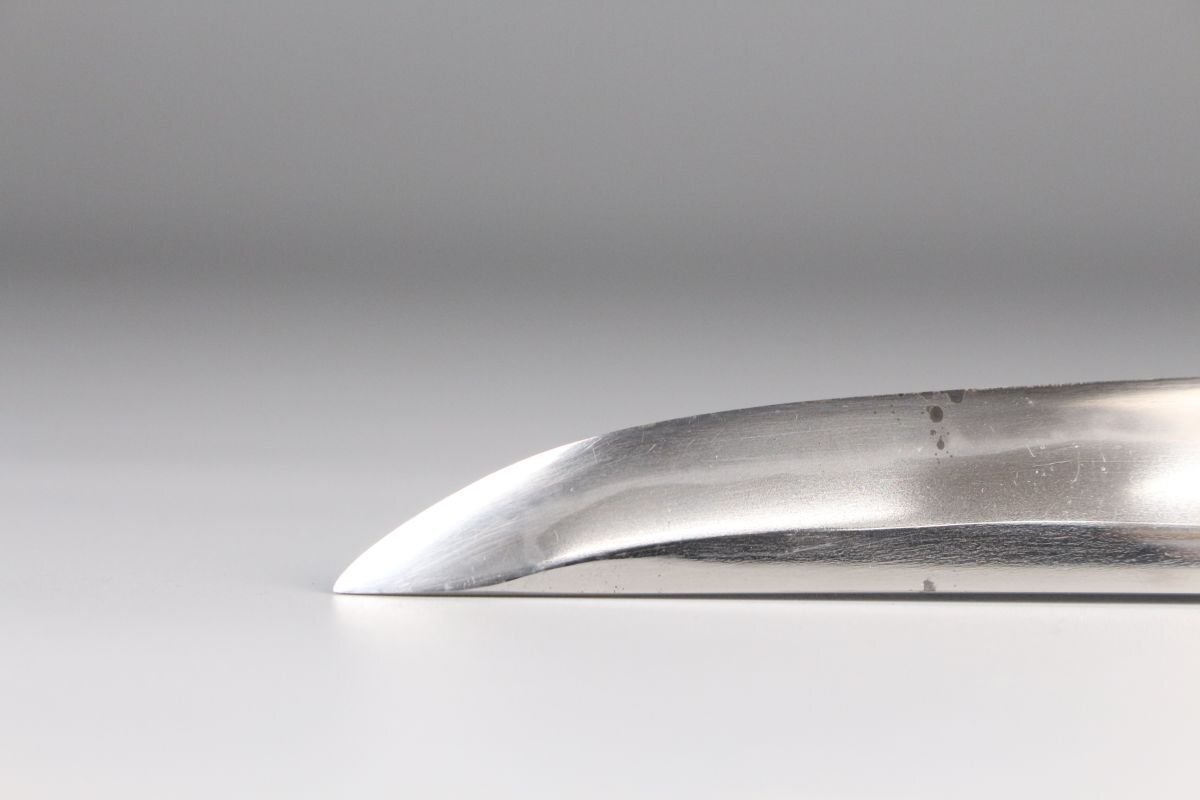 互の目尖りの刃文は冴え、匂口深く冴える様はまさに古刀の趣そのもの。実用性と美を兼ね備えた造形には、戦乱の世に生きた刀工たちの息吹が今も宿ります。