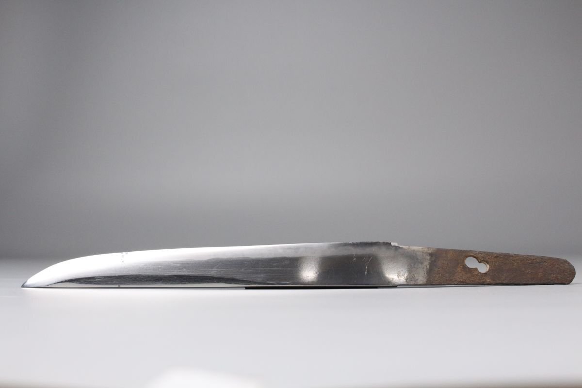 「時代刀剣 鵜首造 無銘 短刀 18.2㎝」は、鎌倉から南北朝期にかけて見られる独特の造り込み、「鵜首造」の魅力を伝える逸品です。棟側から眺めると、まるで鵜の首のように優美に反りを見せ、鋒と棟の流麗な曲線が際立ちます。