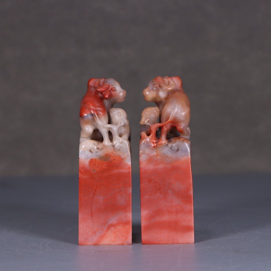 Product name: 【安】清時代 古泥銘 寿山石 芙蓉石彫 母子牛鈕印章一対 印鑑 共箱 極細工 古置物 古擺件 中国古美術 時代物 312