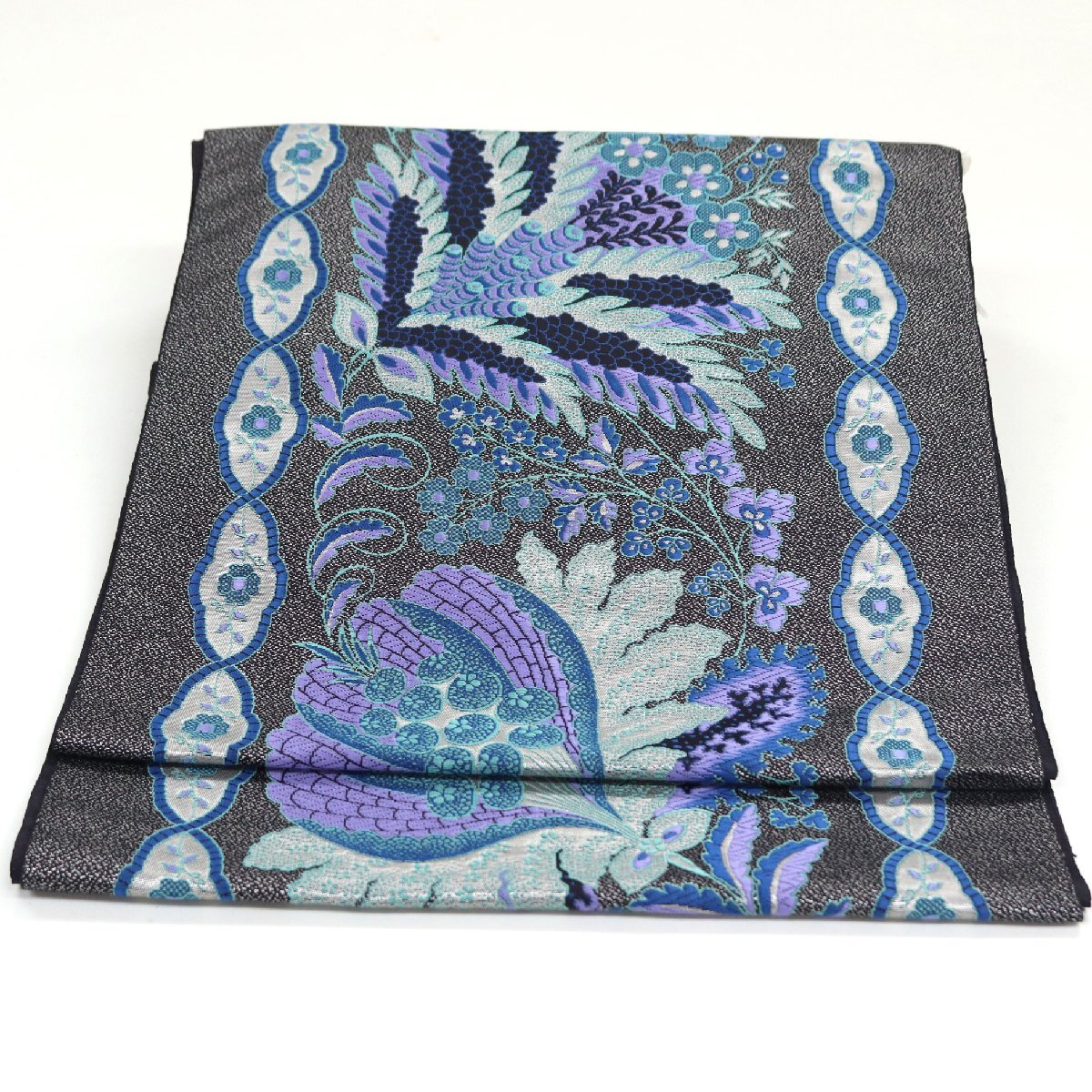 全体には、紺色、青紫色、翡翠色、銀の箔糸で、異国風の花模様が織り上げられております。