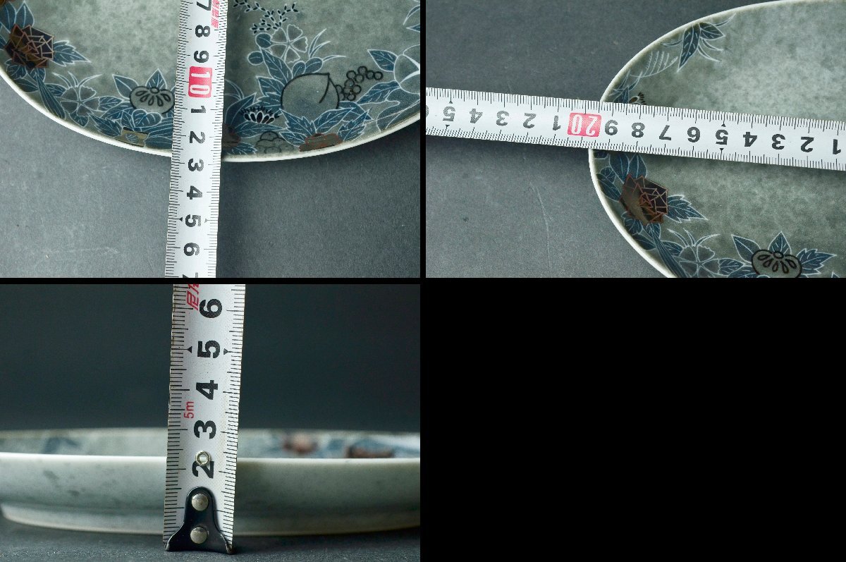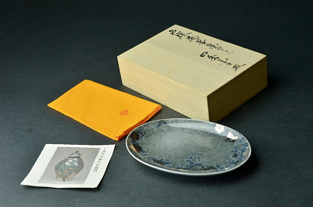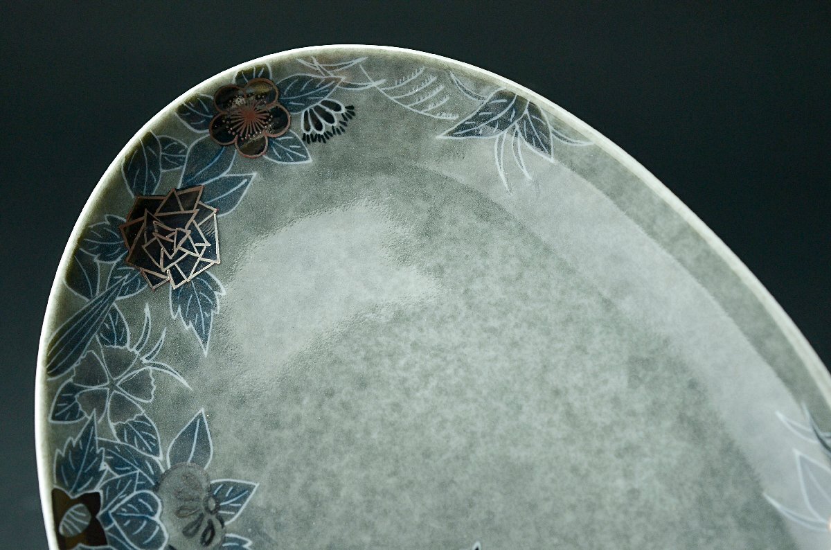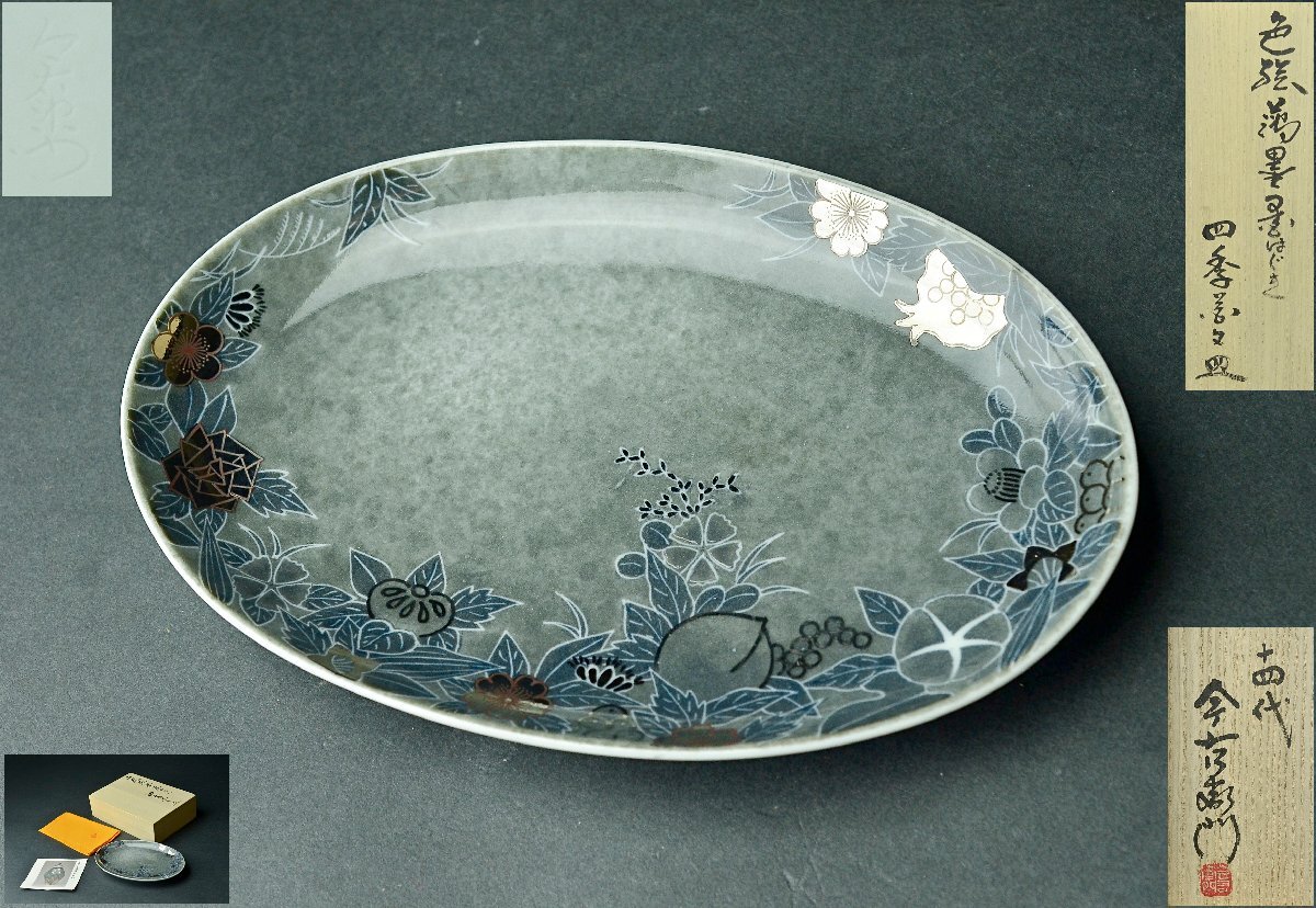 【YB】十四代今泉今右衛門『色絵吹墨墨はじき四季花文皿』人間国宝・共箱付属 径19.7cm ★額皿鍋島焼色鍋島絵皿大皿25Y969-1