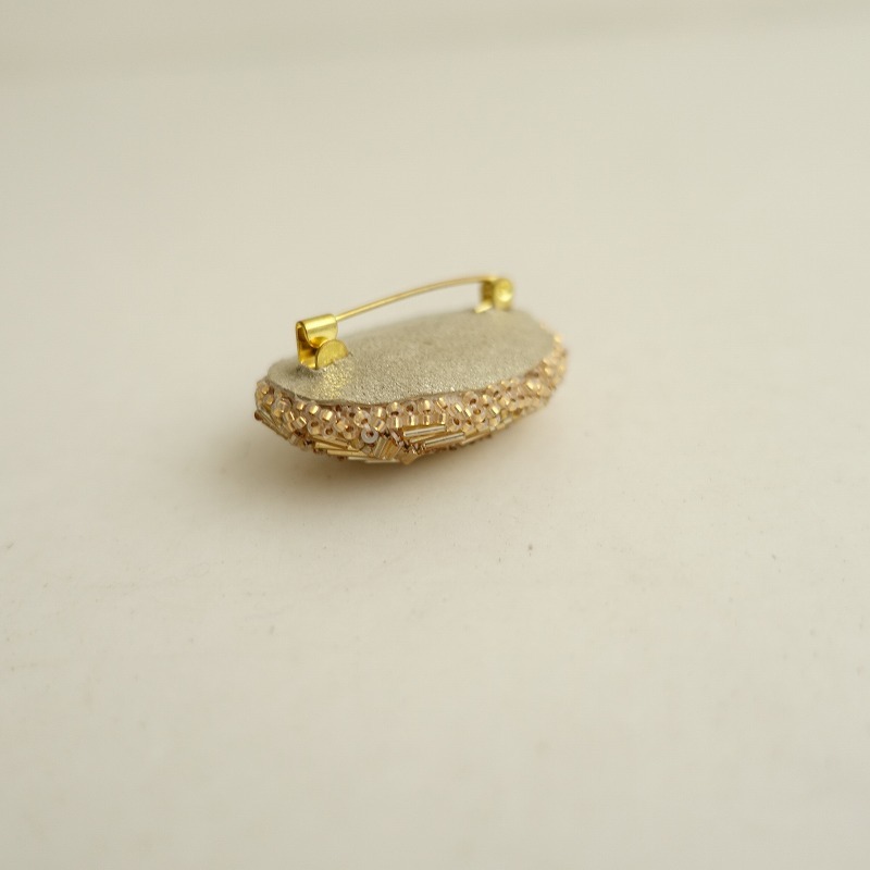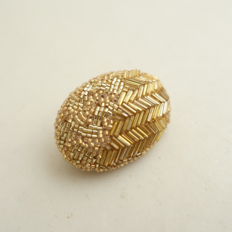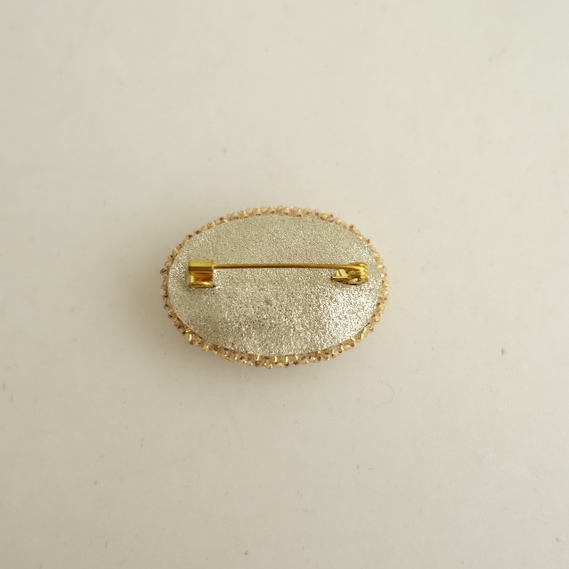 domaciのオーバル ブローチです。カラーは、イエローゴールドやゴールドのビーズが敷き詰められた、華やかなブローチです。アンティークの素材を使用した魅力的なアクセサリーです。