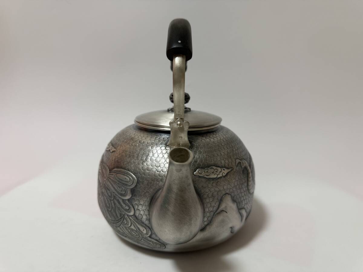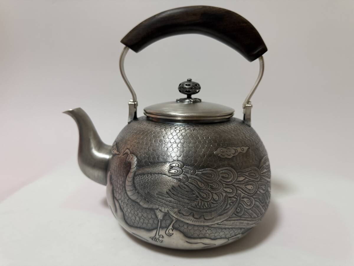 Product name: 時代 純銀製 中川浄益造 孔雀文 透摘 湯沸 工芸品 古美術品 銀瓶 煎茶道具 重さ1497G