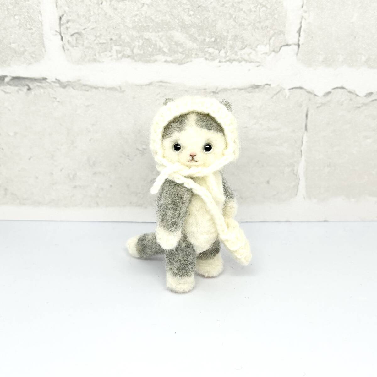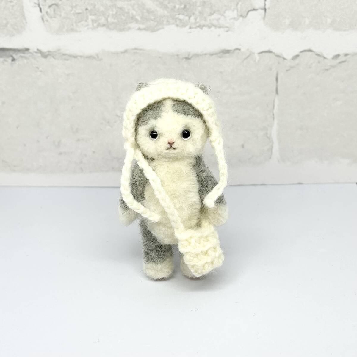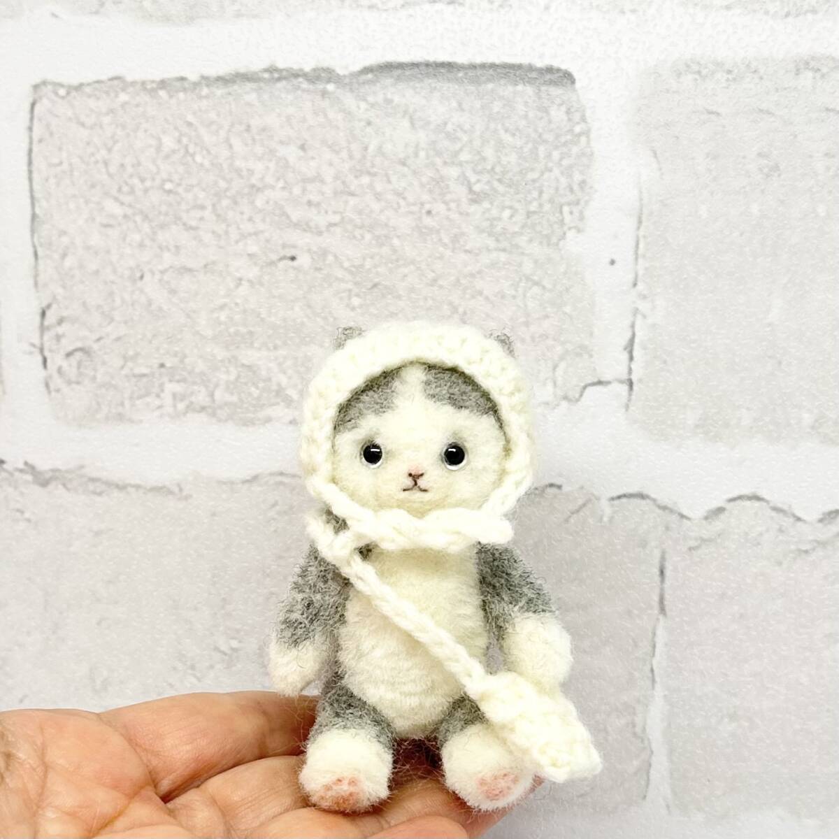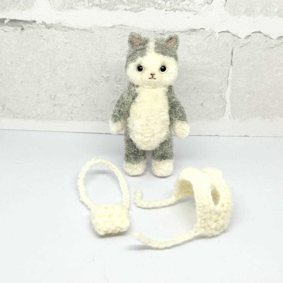ハチワレ猫ちゃん 白コーデ 羊毛フェルト ハンドメイド ミニチュア ぬいぐるみ ねこ