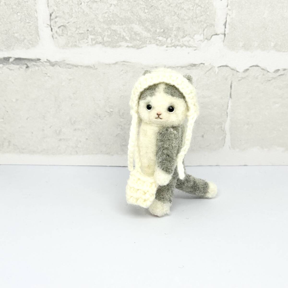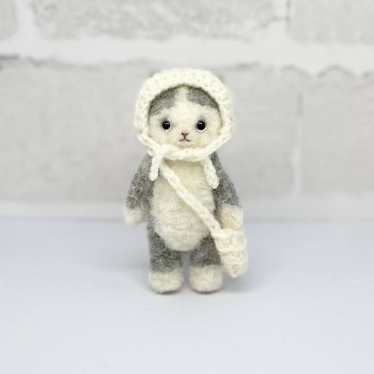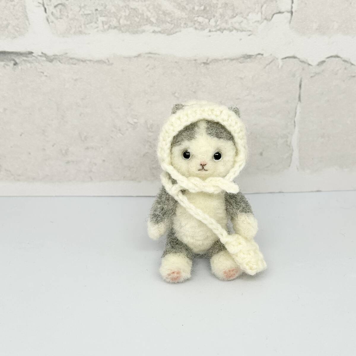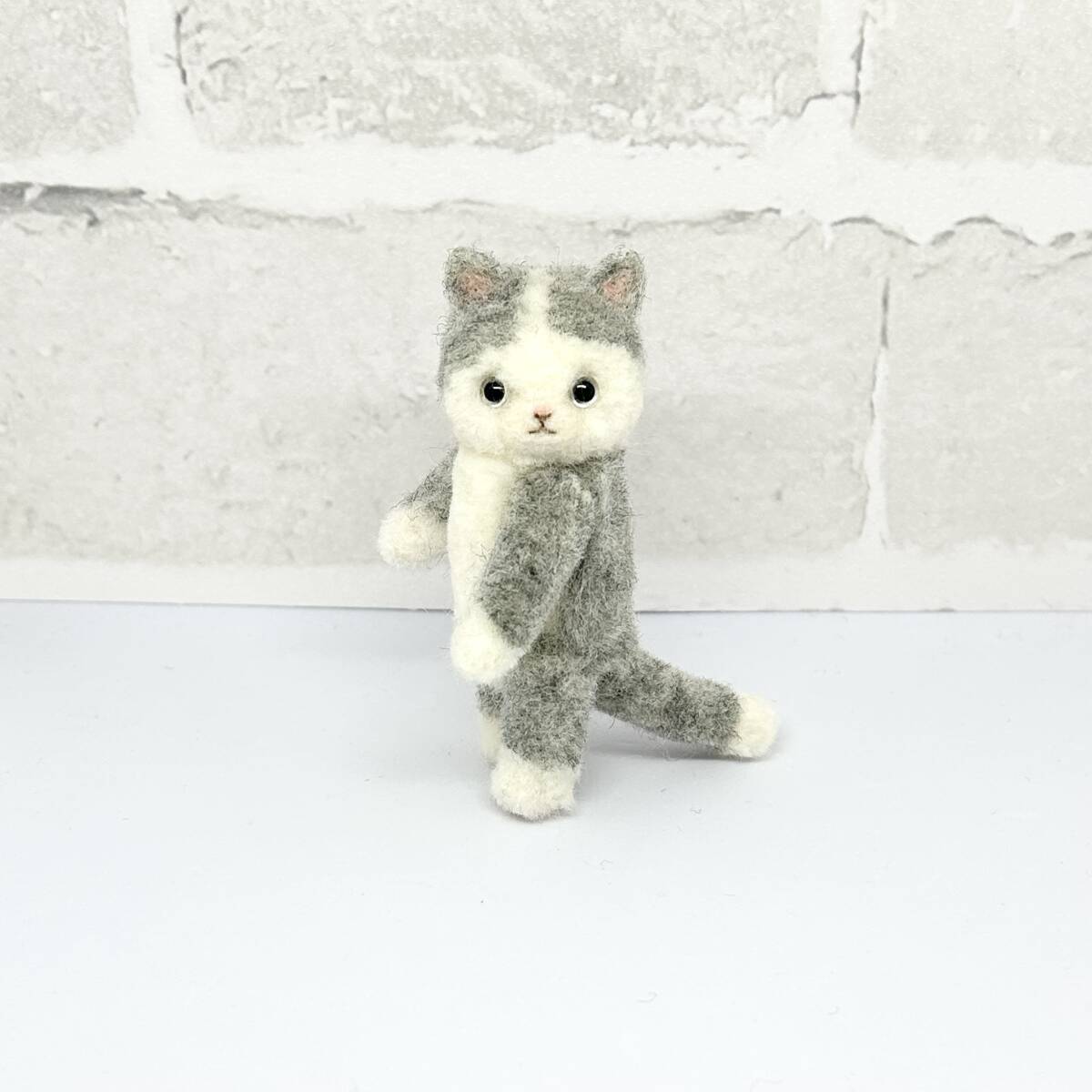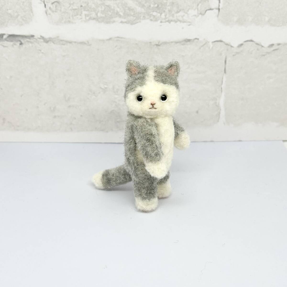 ハチワレ猫ちゃん 白コーデ 羊毛フェルト ハンドメイド ミニチュア ぬいぐるみ ねこ