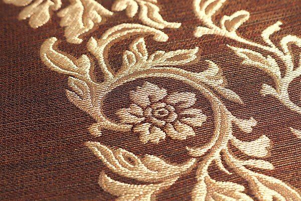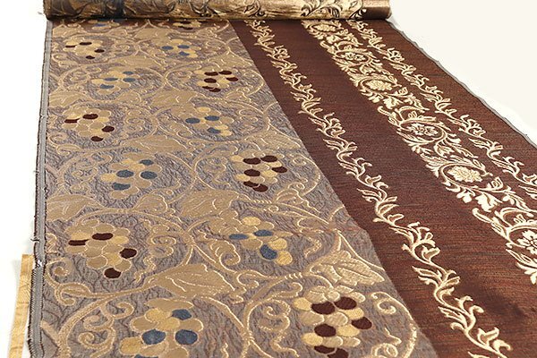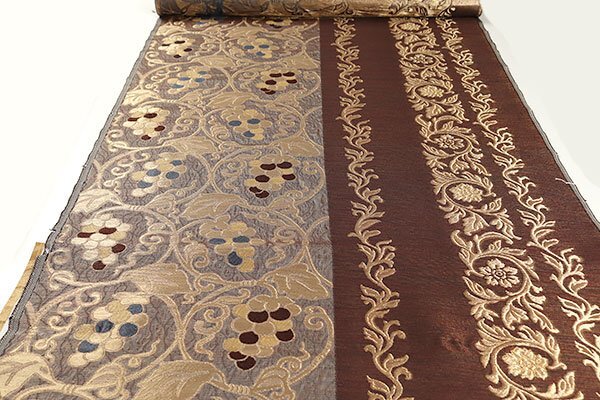 鼠色の部分には葡萄唐草文、銅色の部分には唐花が織り上げられ、重厚感がございます。