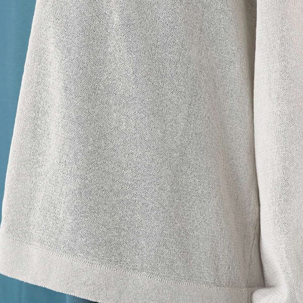 身頃は天竺編みで透け感を、前立ては総針テープで切り替えてきちんと感を出し、
