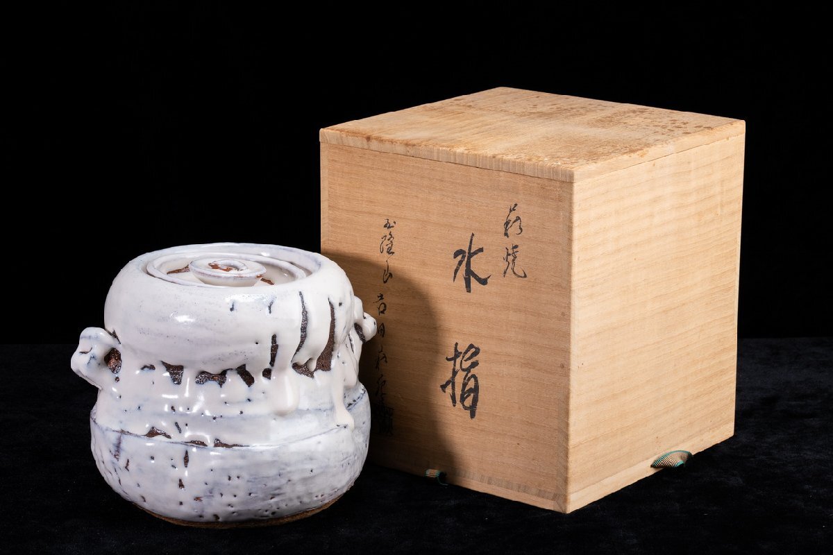 【珍品堂】1円から P30-V16 萩焼 耳付 水指 白萩釉薬 壱 共箱 木箱 茶道具 茶器 煎茶道具 陶芸 工芸品 骨董品 古美術