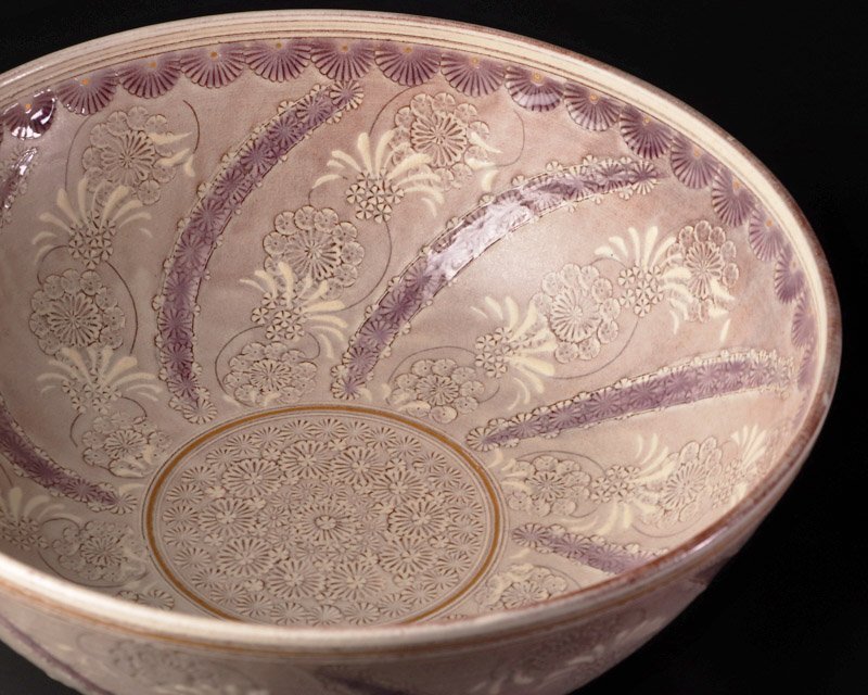 京都・清水焼の窯元。大正時代、京都にて作陶を始めた初代・陶楽の意思を受け継ぎ、「京三島」と呼ばれる繊細な文様の器をはじめ、優美で華やかな器を制作しています。花模様を土に押し当てて文様を施した菓子盆。淡い紫の色合いと、手に伝わるやわらかな質感がやさしさを感じさせ、細部にまで繊細な美意識が息づく作品です。
