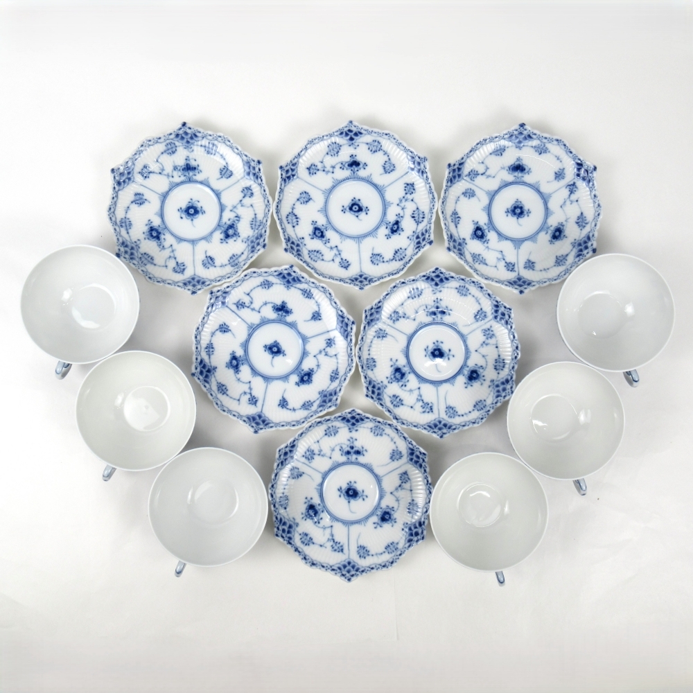 商品名 1円〜 Royal Copenhagen ブルーフルーテッド フルレース ティーカップ&ソーサー 6客/プレイン ティーポット 1点 計13点 一部箱付 4238206