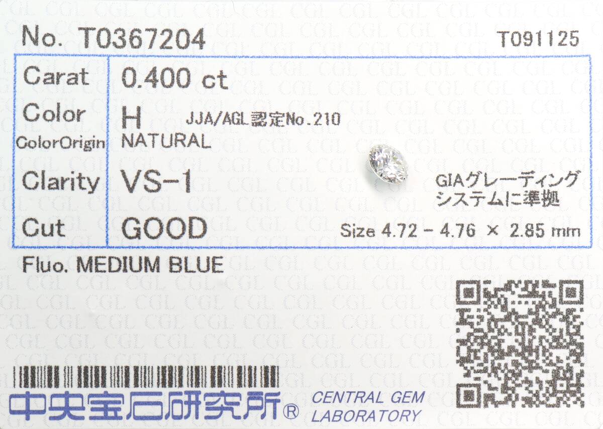 Product name: 【100円~】VS1!0.400ct 天然ダイヤ H(ナチュラルカラー)GOOD