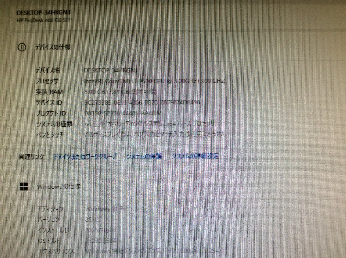 Product name: デスクトップパソコン HP ProDesk 400 G6 SFF i5-9500 / メモリ8GB / SSD256GB / Windows11Pro【引取可/大阪発】1022-1123