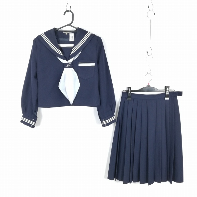 1円 セーラー服 スカート スカーフ 上下3点セット L 冬物 白3本線 女子 学生服 兵庫灘中学 紺 制服 中古 ランクC EY4621