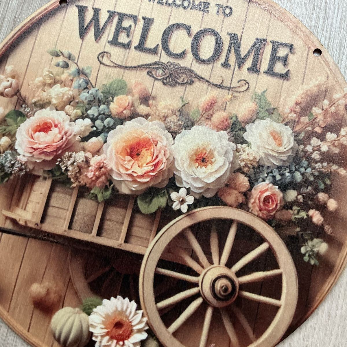 ■新品■木製プレート【看板】ガーデンオブジェ【welcome 一輪車】【円形】ガーデニング 雑貨 オーナメント ビンテージ