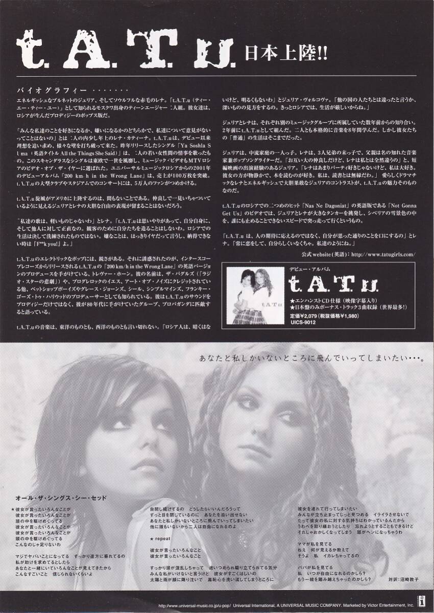 CDチラシ t.A.T.u. タトゥー オール・ザ・シングス・シー・セッド リェーナ・カーチナ ユーリャ・ボルコワ ロシアン・ギャルズ