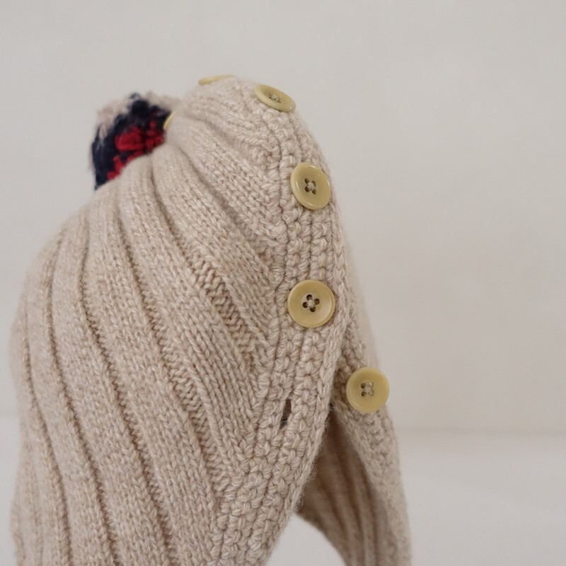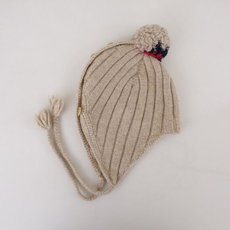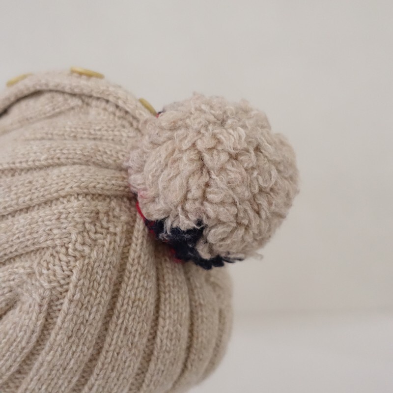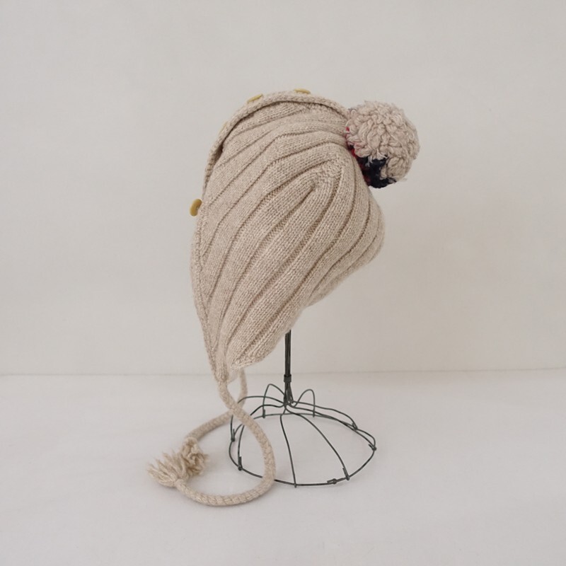 KAPITALの耳当て付きニットキャップです。カラーはベージュのニット素材で、トップに大きなポンポンが付いており、ボタンは開閉していただけます。
