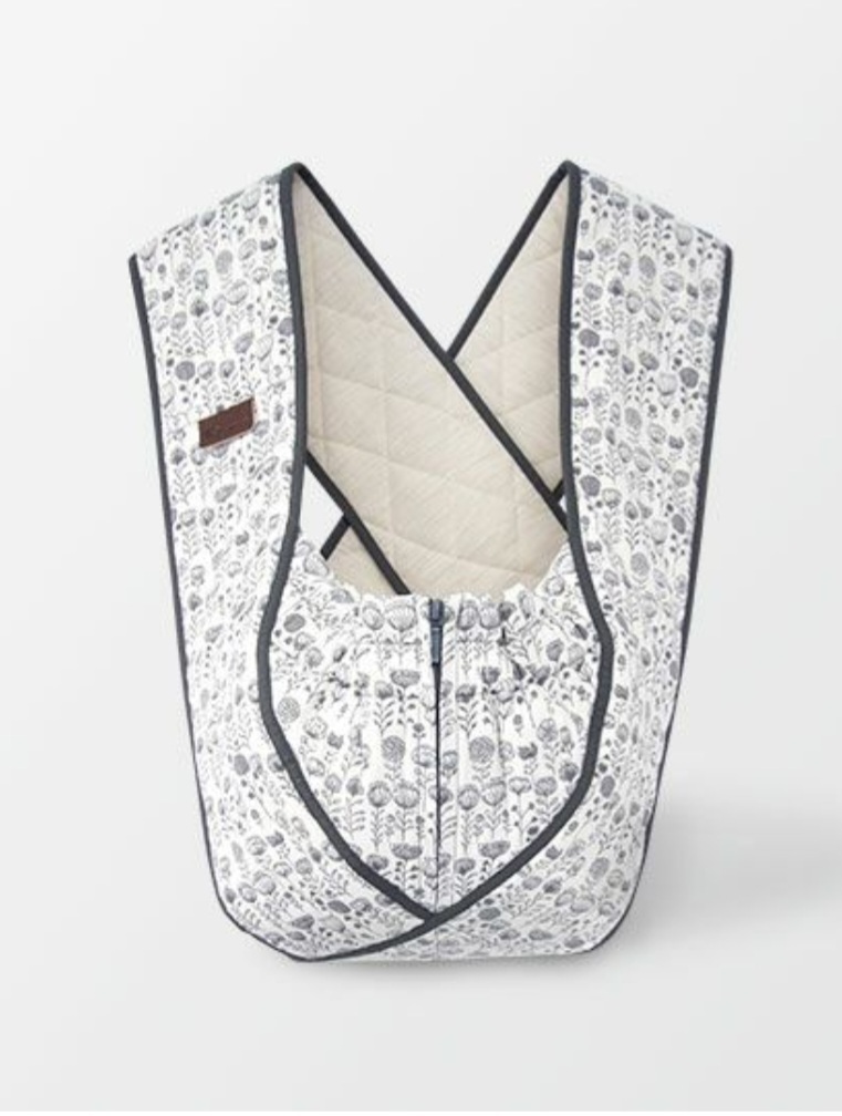 肩に乗る部分の紐を、親指の第一関節くらい肩からはみ出して装着完成です。 赤ちゃんを抱っこします。