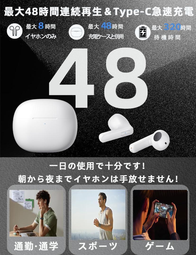 【心に響きHi-Fi高音質・ENCノイズキャンセリング】 より高音質なワイヤレスイヤホンを追求するために、業界最新のSBR + PSテクノロジーを導入して、イヤホンに革新的なMPEG-4 ACCチップを組み込んでいて、解像度が最高!波紋のようにゆっくり広がって深い空間まで叩いて及んでいく低音と、花火が登っていくほどきれいな、透き通った高音がぶつかり合うことなく自然に耳を流して、さらに13mm大口径ドライバーを搭載され、想像以上の臨場感のある高音質で、耳に前例がない音楽体験をもたらします。最大30dBのノイズを低減できると最先端CVC8.0+ENCノイズキャンセリング技術を搭載しているワイヤレスイヤホンは、街の喧噪や電車中の雑音、風切り音など環境ノイズにもかかわらず、クリアな通話が可能となっていてゲーム中に音源の方向知覚も優れています。ZOOMで行いのオンライン授業、会議にも、通学通勤やゲームにも適した完全ワイヤレス イヤホンです。