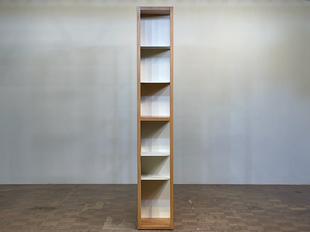 単一な厚みのビーチ無垢材で構成したサイドの抜けたミニマムで軽やかなシルエットに、自由に可変するうっすらとしたホワイトプレートでシステムとしての機能と、背面にゆったりと大ぶりな杢目を描くビーチ材の静かなテクスチャーで飾った、クラシックモダンの名作。