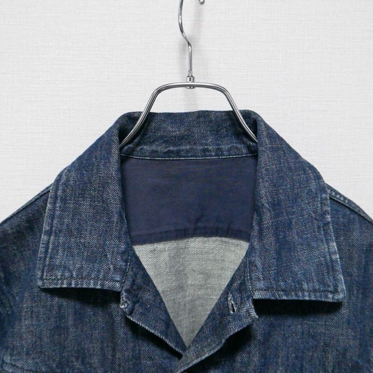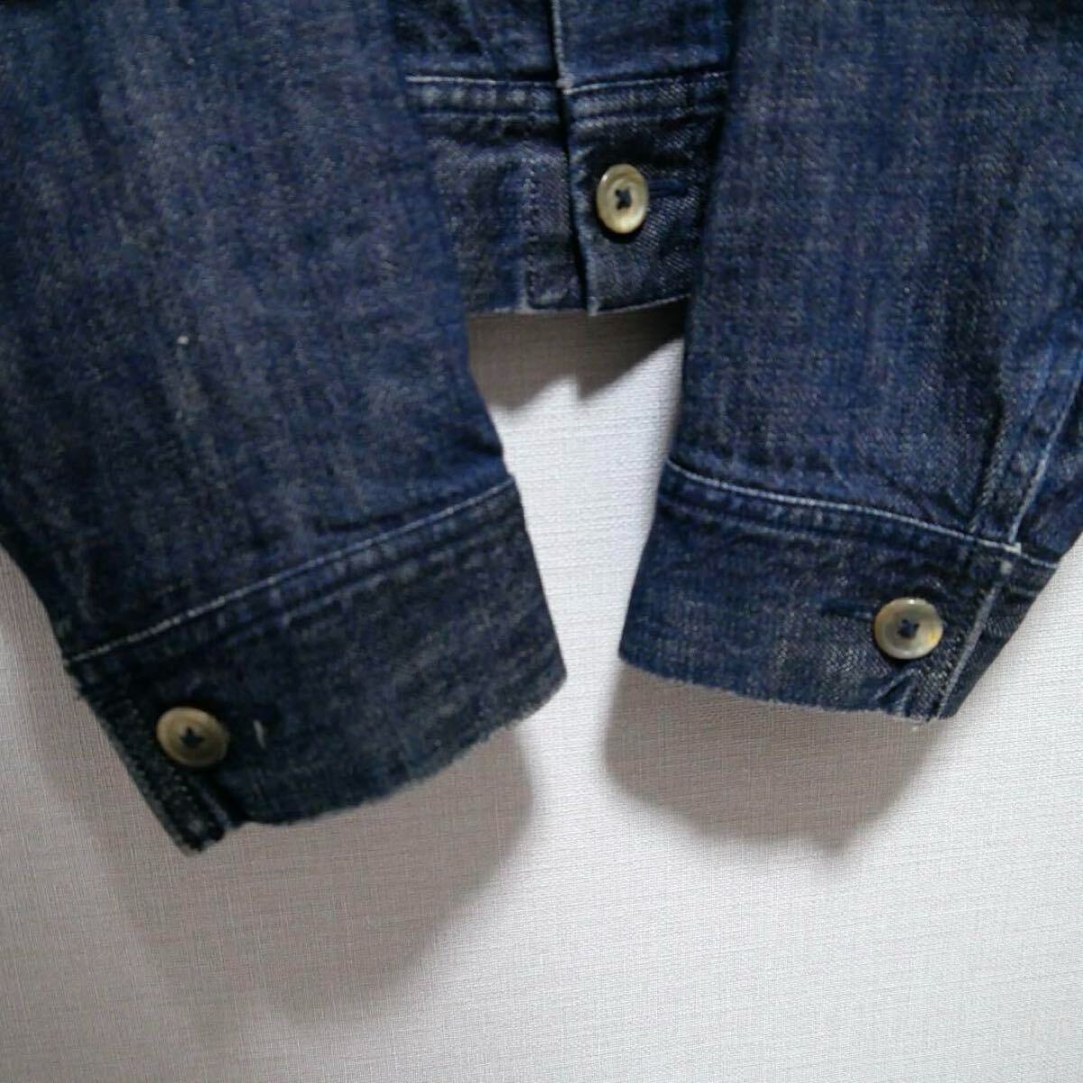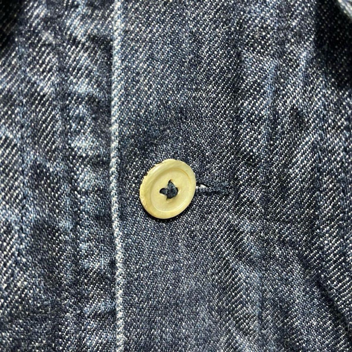 デニムと同系色の濃紺のステッチ、シェル調のボタンや内ポケット、
