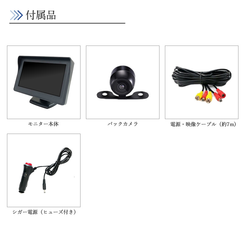 モニター本体×1、バックカメラ本体×1、映像・電源ケーブル(約7m)×1、シガー電源(約3m)×1