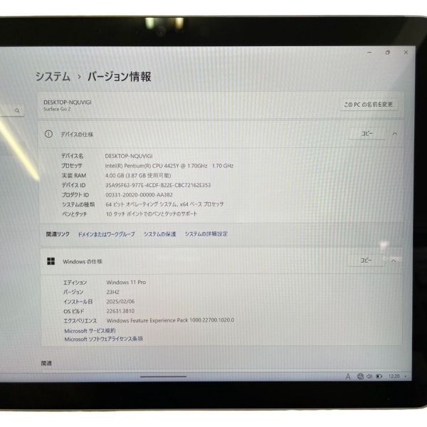 Microsoft Surface Go 2 Intel Pentium CPU 4425Y 10.5型 メモリ 4GB SSD 64GB Windows 11 カメラ 動作品 キーボード無し NO.Y7019-1
