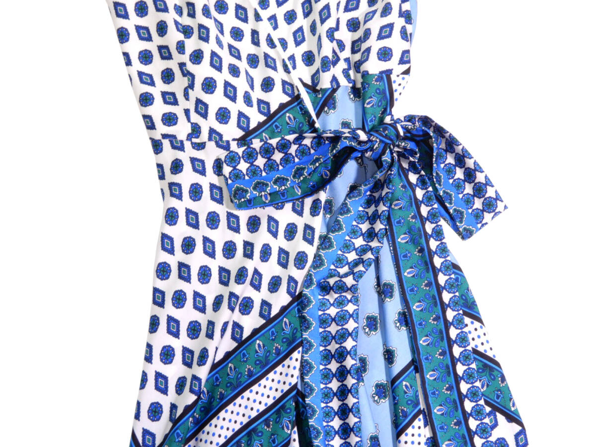 ザラ ZARA 大人素敵スタイル☆ 微光沢 スカーフ風プリント イレギュラーヘム カシュクール デザイン ワンピース M