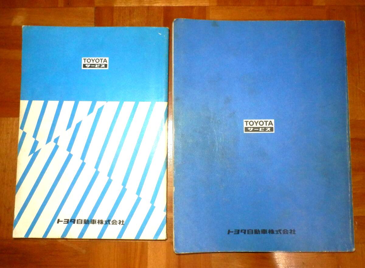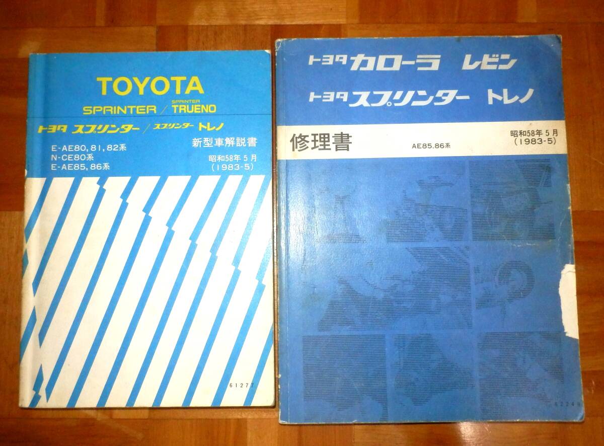 名車AE86の新型車解説書と修理書です。40年以上前の書籍となり、経年劣化、表紙裏隅に在庫管理用印等見られます