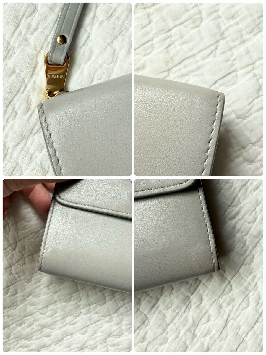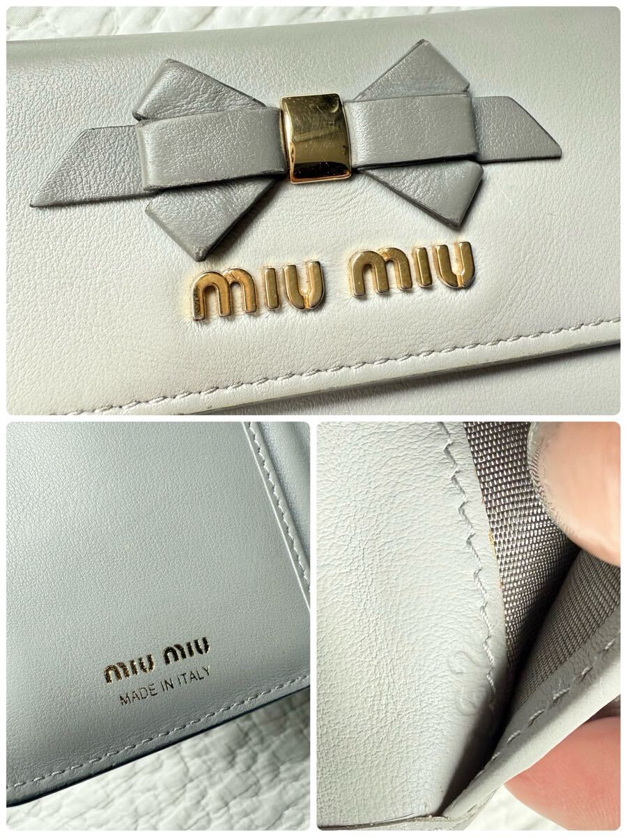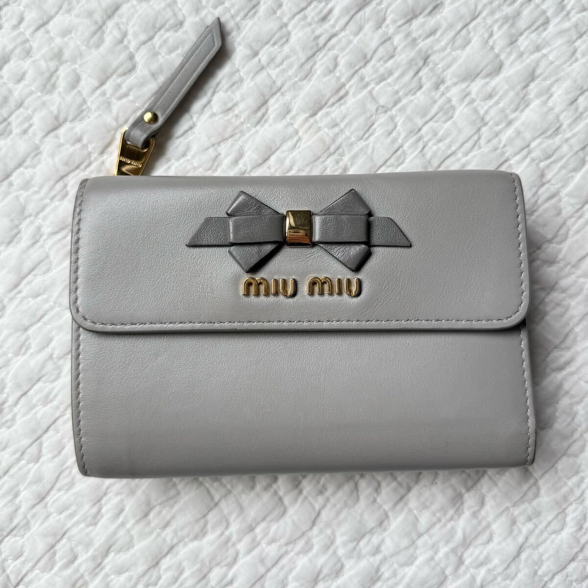 Product name: 美品 miu miu 三つ折り財布 リボン ミュウミュウ ロゴ レザー 牛革 グレー ゴールド金具 コンパクトウォレット レディース 5ML014
