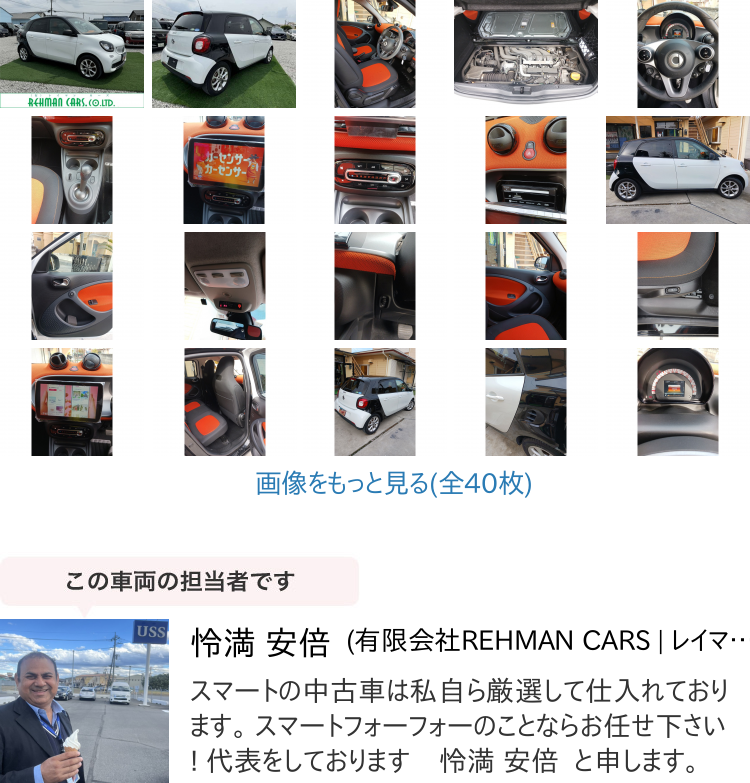 「中古車ならではのお得感を実感できるスマートの新型車「スマートフォーフォー」をご紹介します。2018年式にて走行距離はわずか18010km、静かで快適な走りです。ボディに傷はございますが修復歴はございません。内装が外車ならではのビビッドのオレンジ色がとてもお洒落で個性的です。暖かい座席で冬でも快適に運転できるシートヒーターも搭載しています。当店ではお客様に安心して購入して頂くため、ご来店していただき試乗されることをお勧めしております。お気軽にお問い合わせください。