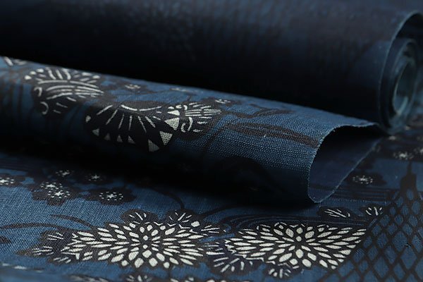 ざっくりとした風合いの麻の帯地は深い紺色のお色目でございます。